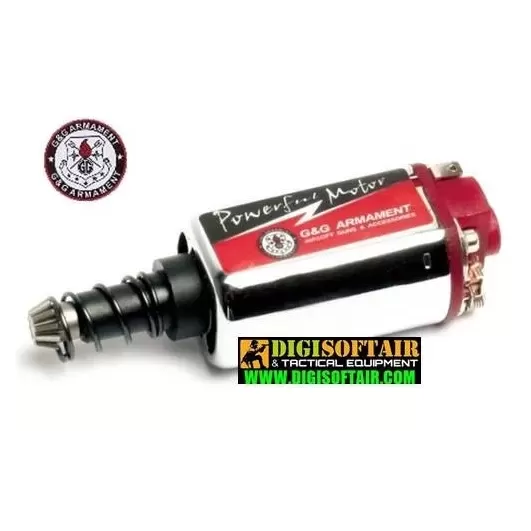 G&G High Torque Airsoft Motor High torque motor used for M4 M16 and most version 2 gearboxes. More durable and more powerful. Dramatically increase your muzzle velocity when using Harder springs! Features: *Torgue Type *Long Type *High Preformance *10 tooth pinion gear