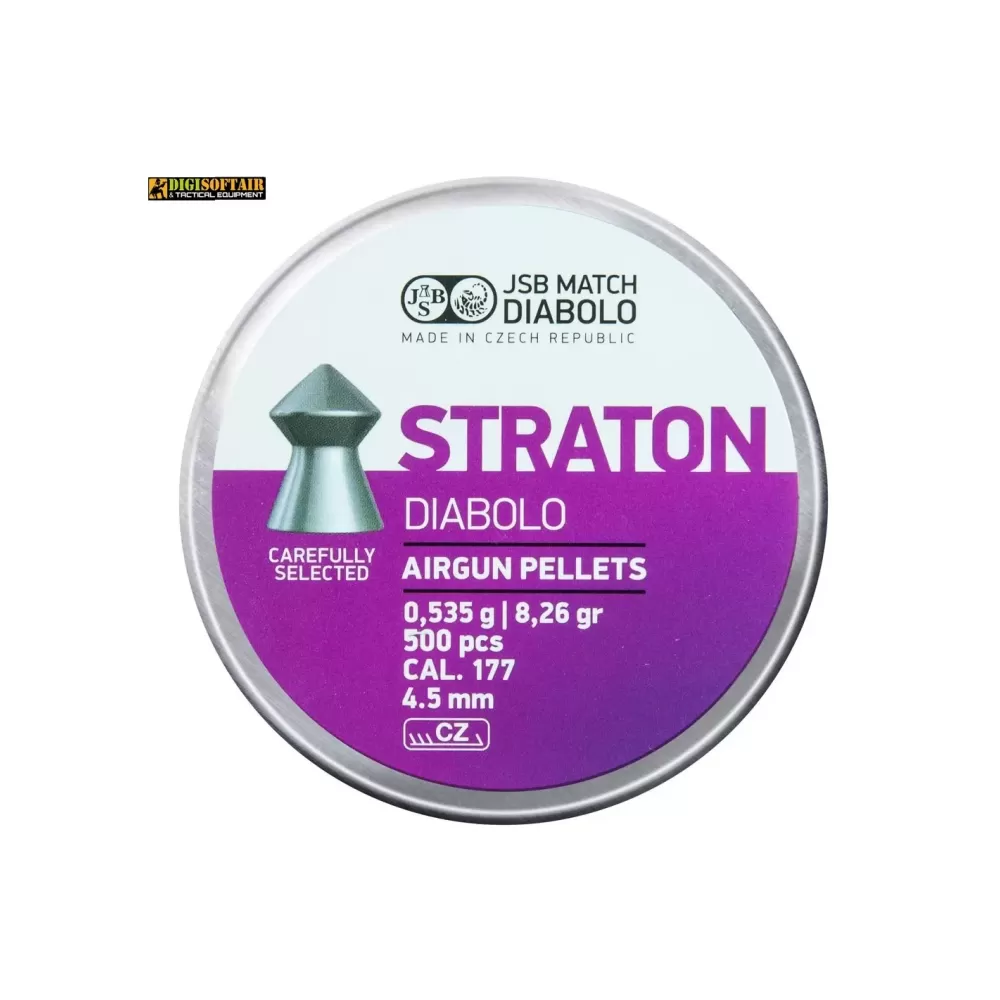 Discover the 4.5mm JSB brand airgun pellets, Straton model, in a pack of 500. Have fun and take your 4.5mm air rifle for hunting. This pointed projectile will awaken the hunter's soul in you.