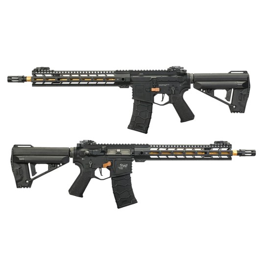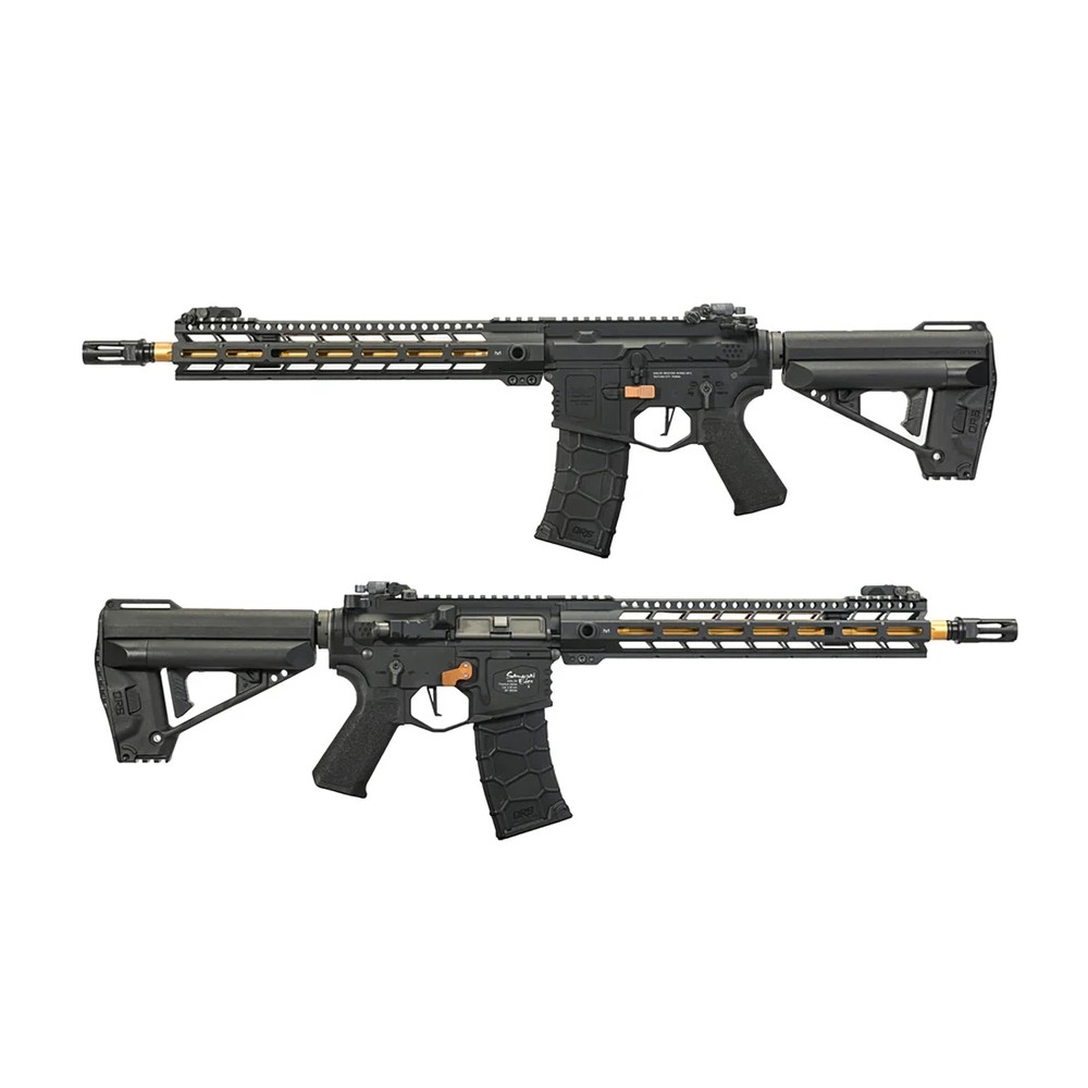The Avalon Samurai EDGE AV1 M4 Gold is a high-end AEG platform engineered for tuners and serious players. The Gold finish highlights a gold outer barrel while keeping a rugged, upgrade-ready build: Version 2 gearbox with quick spring change (ECS), integrated GATE Aster ECU electronics and ambidextrous fire controls. Optimized for the Italian market with a maximum power setting of 0.99 J, the AV1 M4 Gold balances precision, advanced electronics and a premium look.