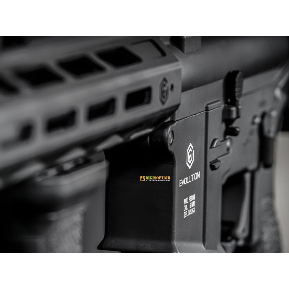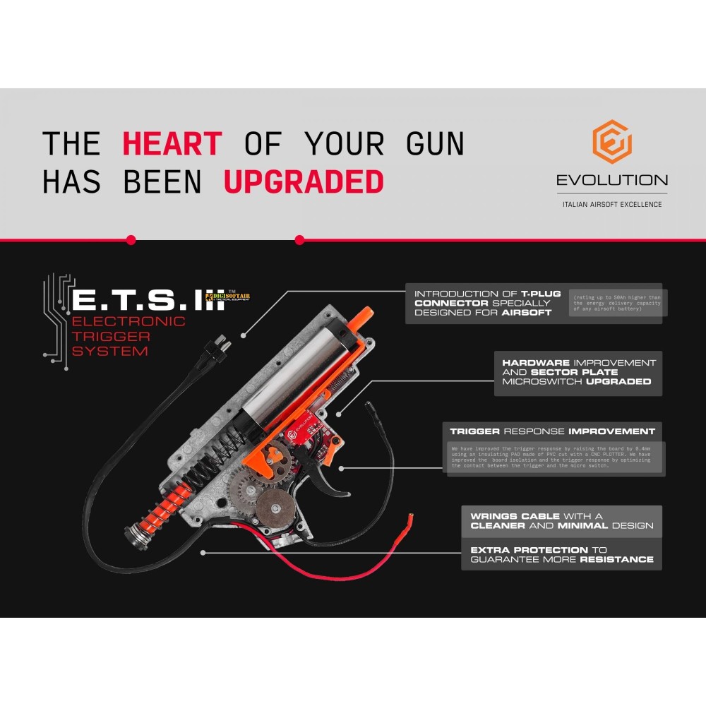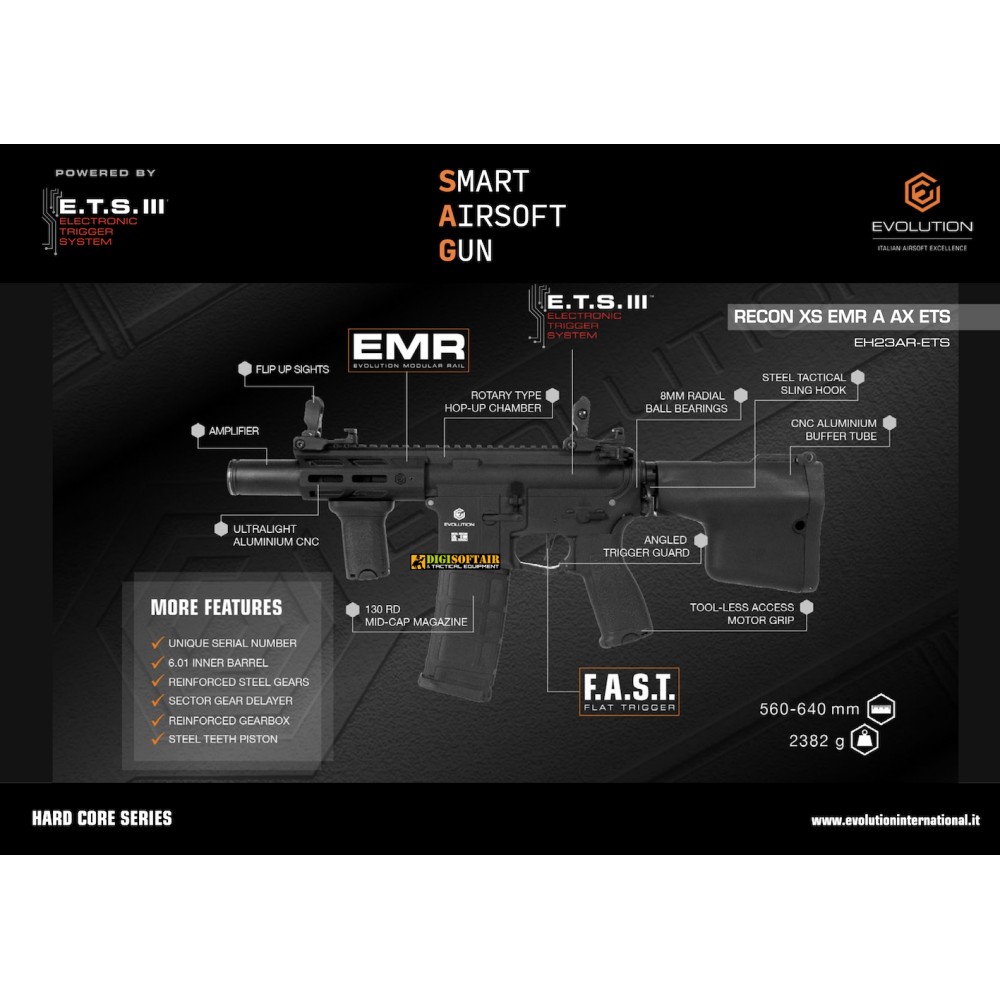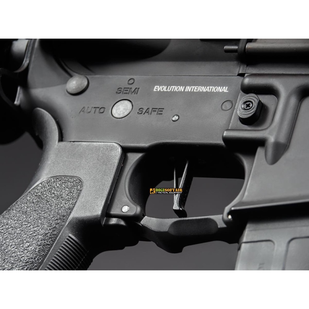 Reinforced airsoft rifle, 0.99 Joule max shooting power, metal Gear Box, steel gears and fully customizable mechanics. Adjustable stock in polymer. Programmable fire selector. Adjustable hop-up system.