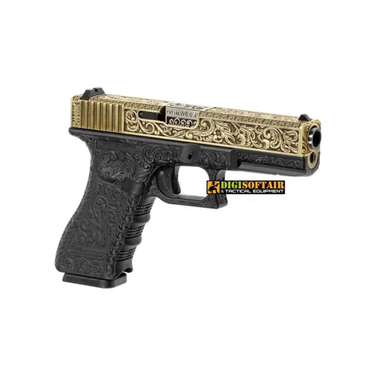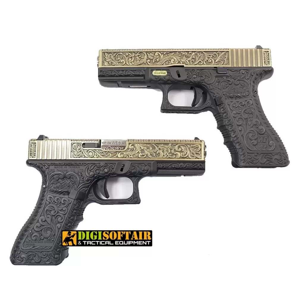 A refined balance of style and function: the WE G17 Etched Ivory pairs dependable G17 ergonomics with decorative details that stand out in the field. The polymer frame provides a comfortable, durable grip while the metal slide delivers authentic weight and slide-action feel. Blowback operation offers realistic feedback, adjustable hop-up lets you tune trajectory, and the build is designed to endure regular use. Ideal for players and collectors seeking a replica that combines personality with practical performance.