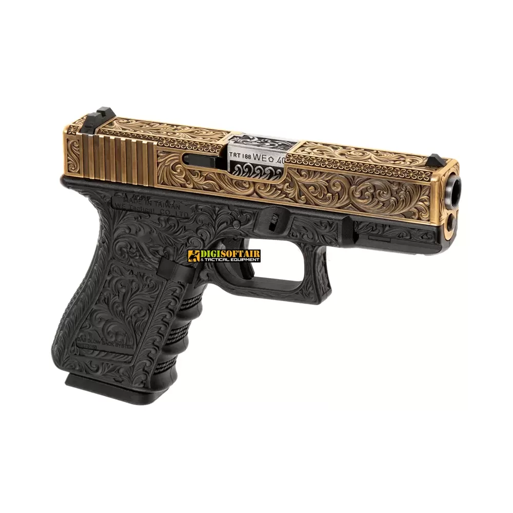 Compact, well-balanced and characterful: the WE G19 Etched Ivory brings the G19 platform into a smaller footprint without sacrificing feel. The polymer frame offers ergonomic grip and reduced weight where needed, while the metal slide provides the tactile feedback expected from quality replicas. Slide-action blowback delivers realistic recoil sensation, adjustable hop-up lets you tune trajectory and accuracy, and the etched decorative finish gives personality while keeping structural integrity. Suited for players seeking a compact sidearm for gameplay, training or collection.