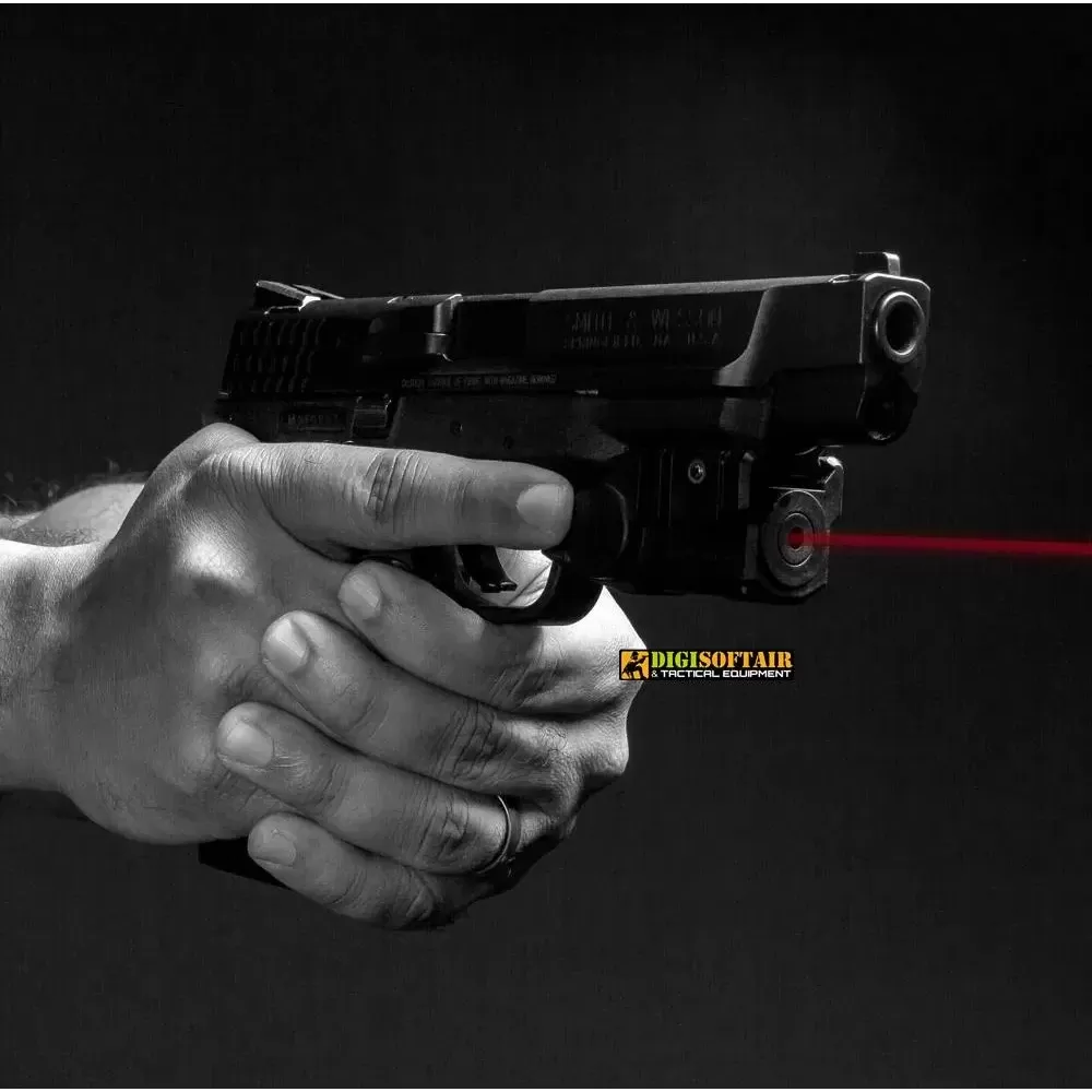 Compact red laser for Weaver/Picatinny mount, output <5 mW (Class IIIA), extended night visibility and up to ~19 hours continuous runtime.