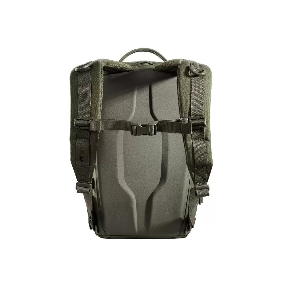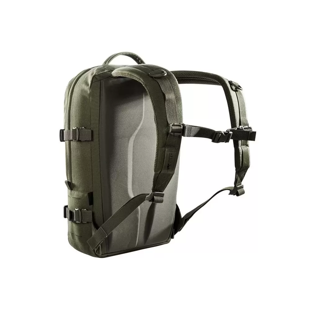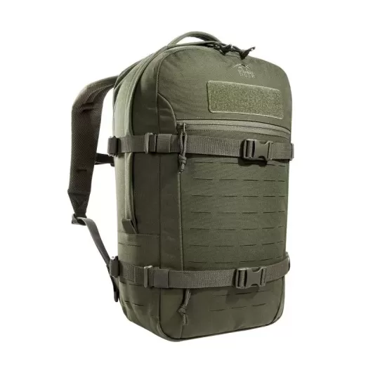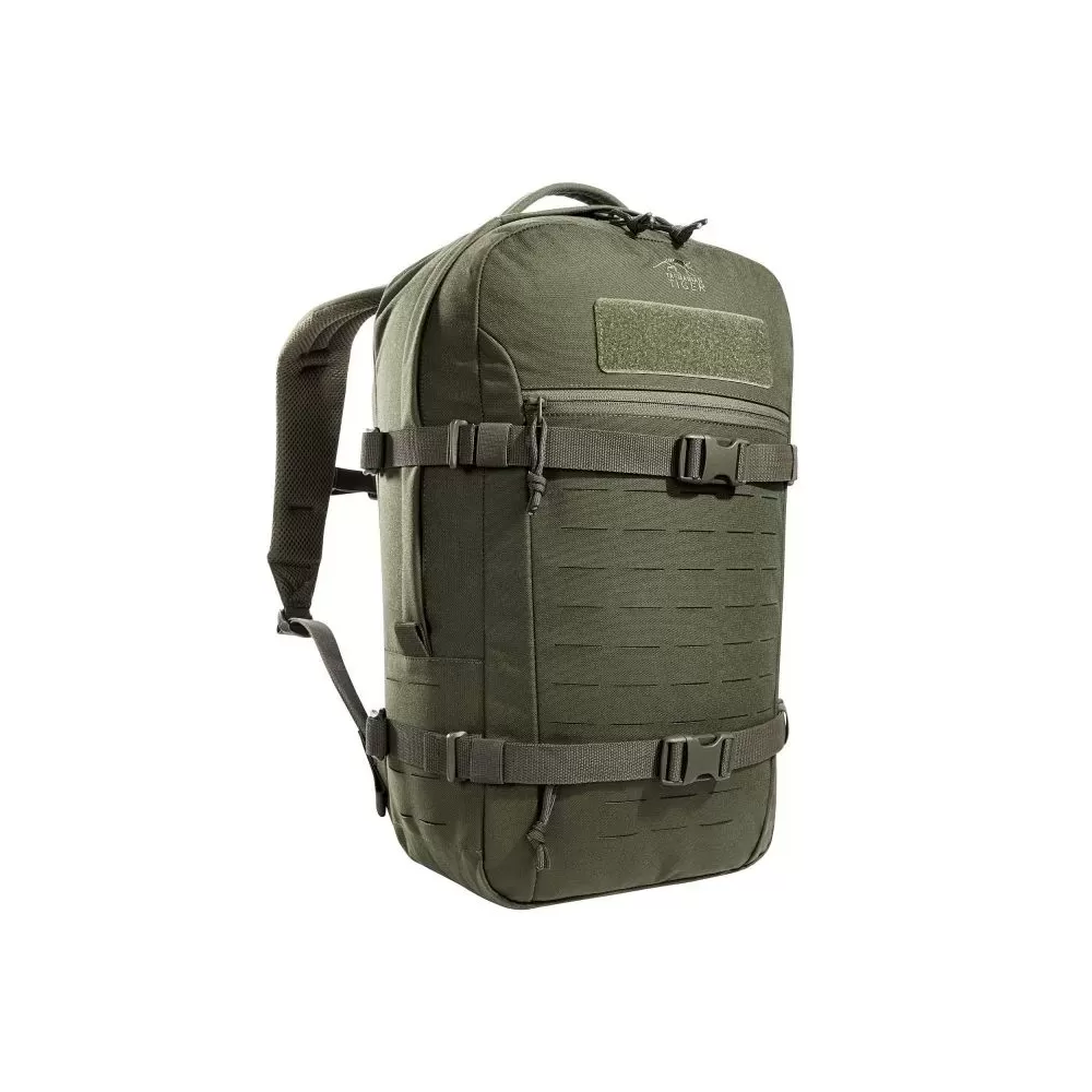 Modular daypack with 23 liters of volume. The backside of the main compartment of the daypack is lined with MOLLE hook panels for attaching compatible loop pouches.