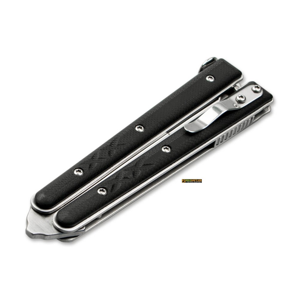 The black G10 handle, paired with stainless steel liners, delivers a secure grip even in challenging conditions. The traditional balisong construction allows smooth, controlled manual opening, making this model suitable for collectors, flipping enthusiasts and users seeking a compact, durable butterfly knife.