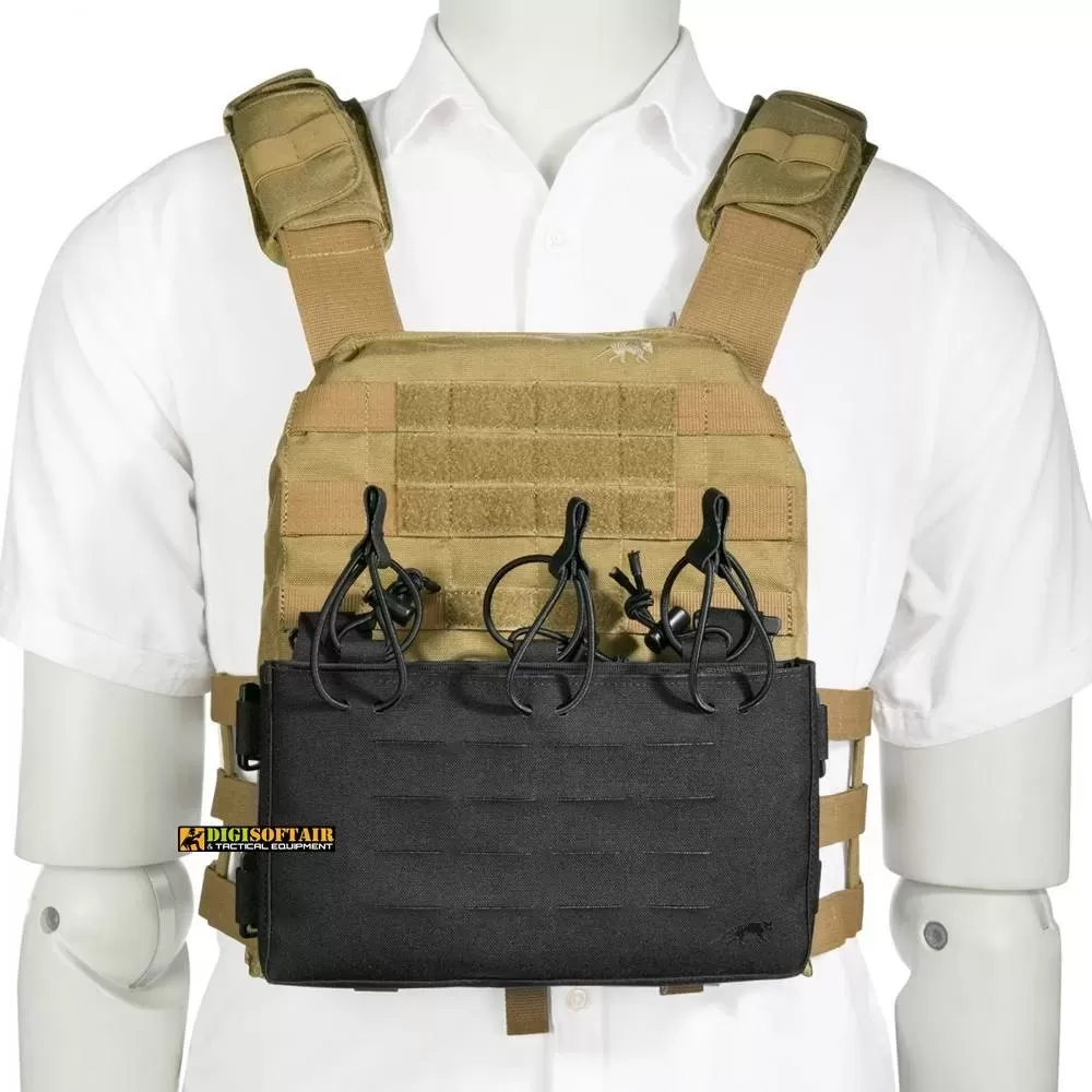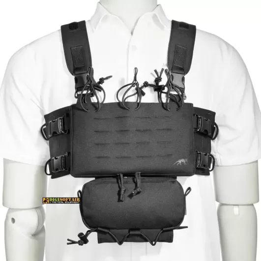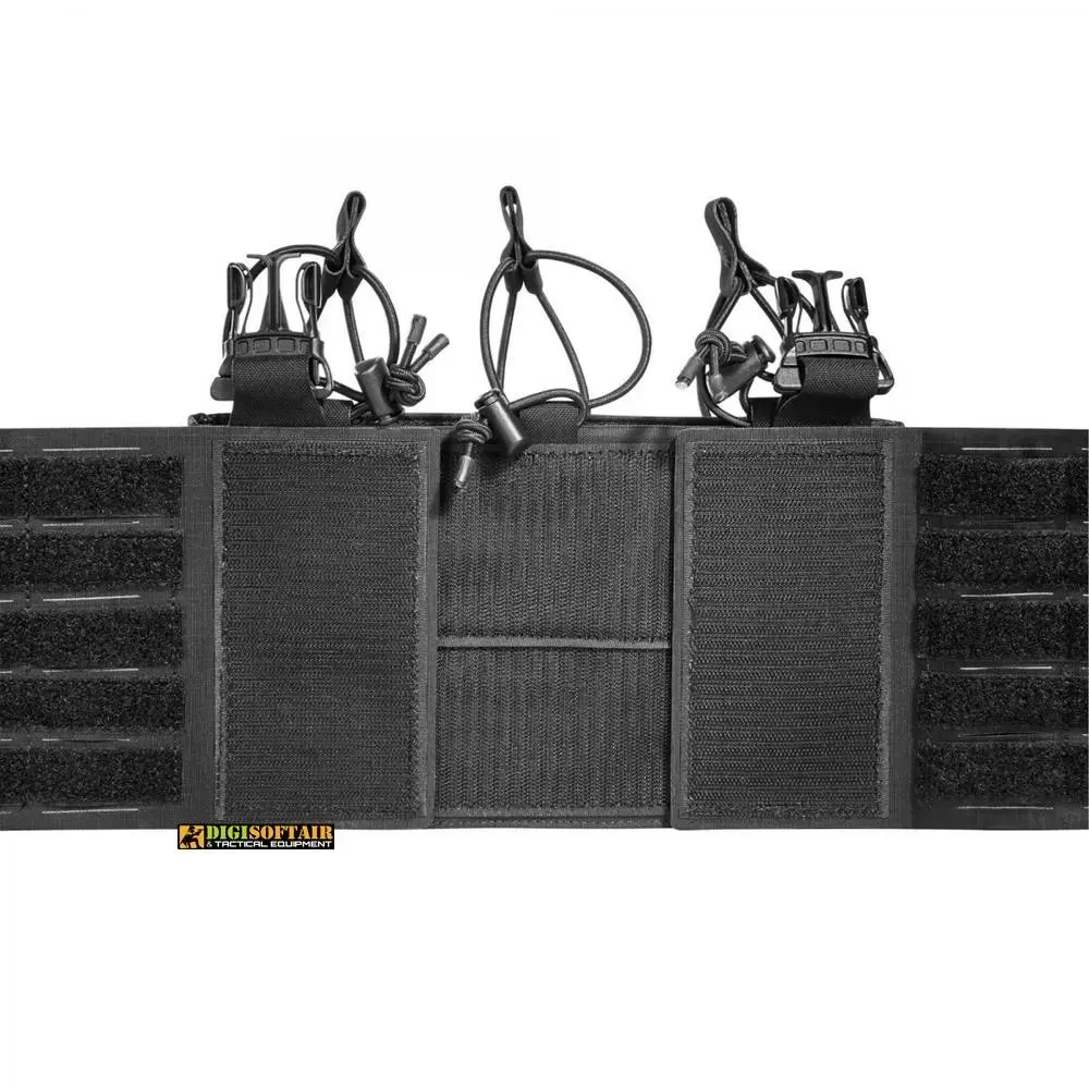 The Tasmanian Tiger TT Small Combi Rig Belt Harness in Black (7224) is a mini chest rig that offers flexibility and modularity. It features a removable magazine module with a hook-and-loop attachment system that can be used on plate carriers (plate carrier not included).
