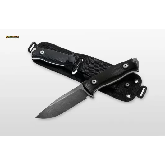 Compact, heavy-duty fixed blade designed for outdoor and tactical use: 115 mm Sleipner blade with black PVD/stonewashed finish and durable black G10 handle.