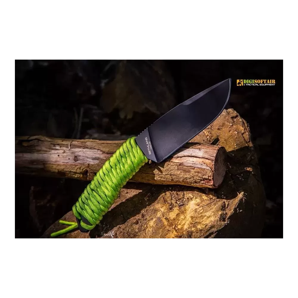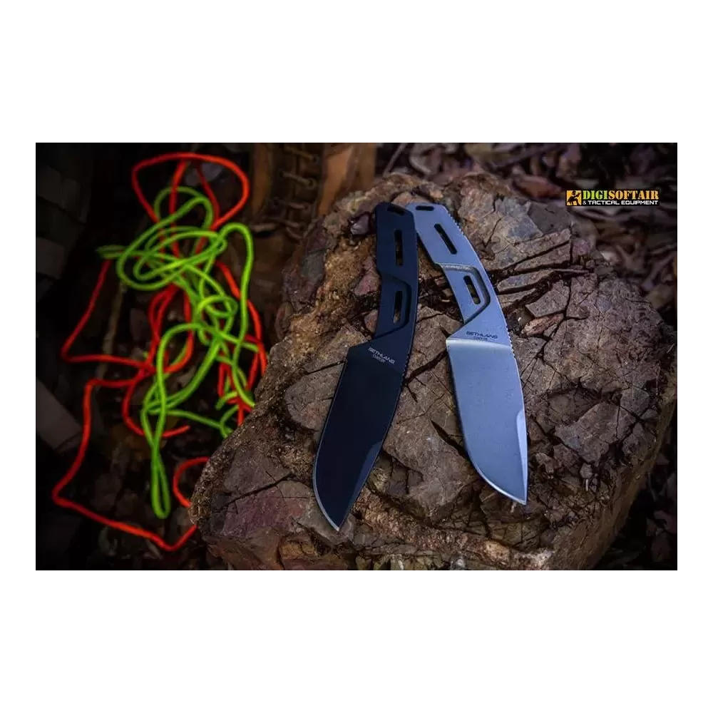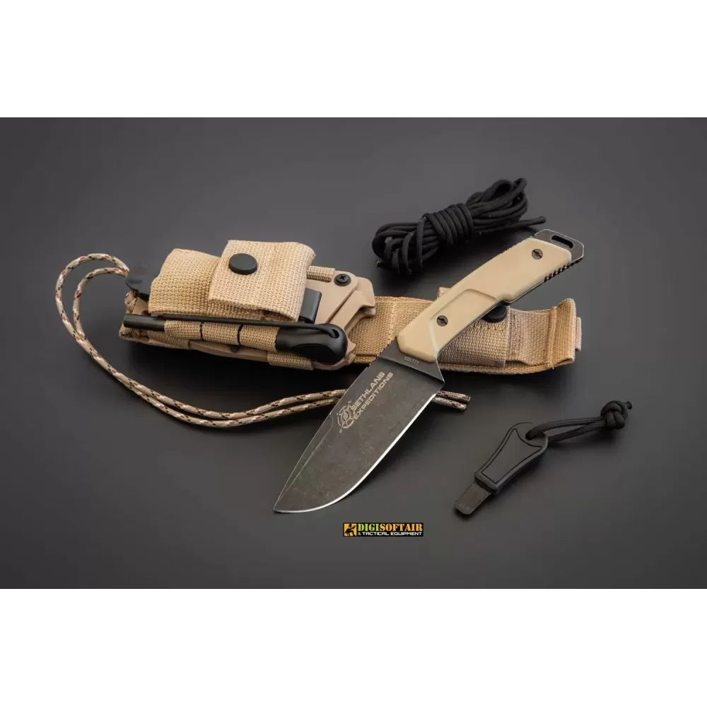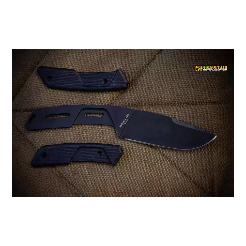 The Sethlans D2 Black is a fixed-blade tool designed for demanding field use—bushcraft, survival and general outdoor work. The Black variant uses D2 tool steel (thermally and cryogenically treated to 60 HRC) with an EXP DARK protective coating to enhance hardness and wear resistance. Blade geometry and a flat grind, combined with a tapered thickness from 6.3 mm down to 4 mm, deliver a reliable balance of strength and cutting performance. G10 handle scales offer ergonomic grip and are removable to reveal the skeletonized full-tang for weight saving or paracord wrapping. The package includes a lightweight, removable Kydex sheath configurable for left/right carry and a M.O.L.L.E mini-pouch with a dual-grit sharpening stone and a firesteel.