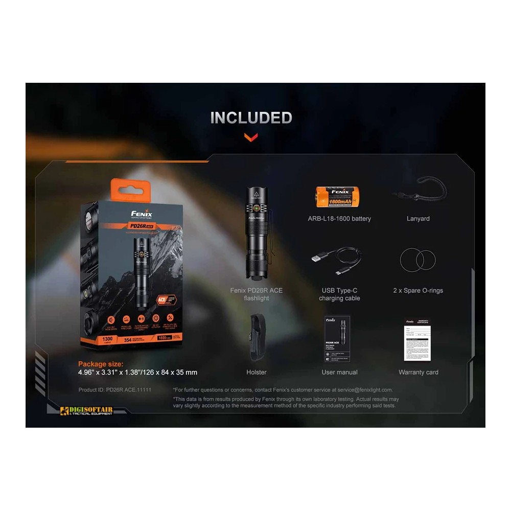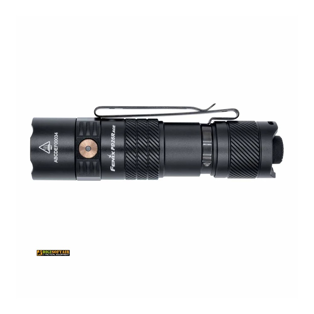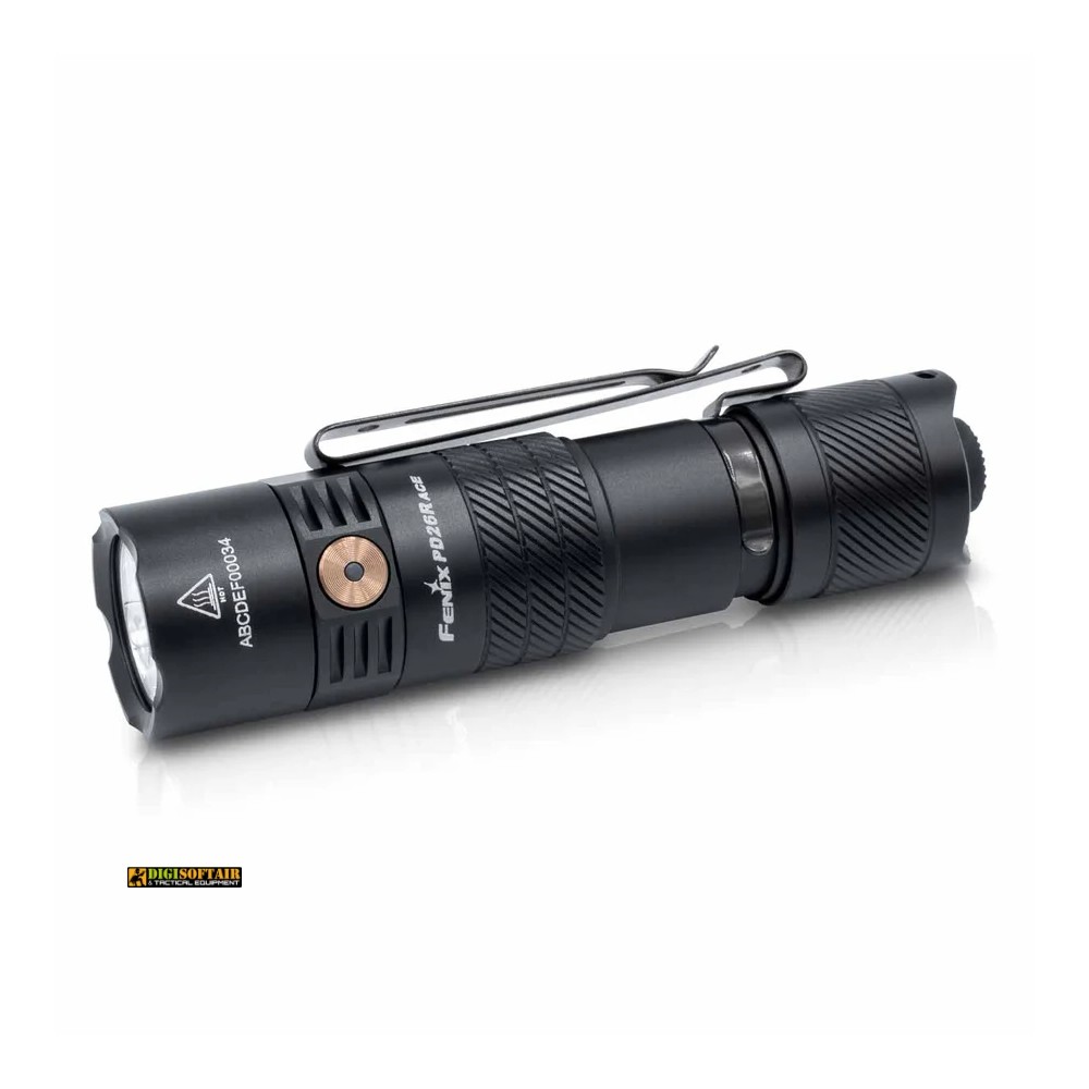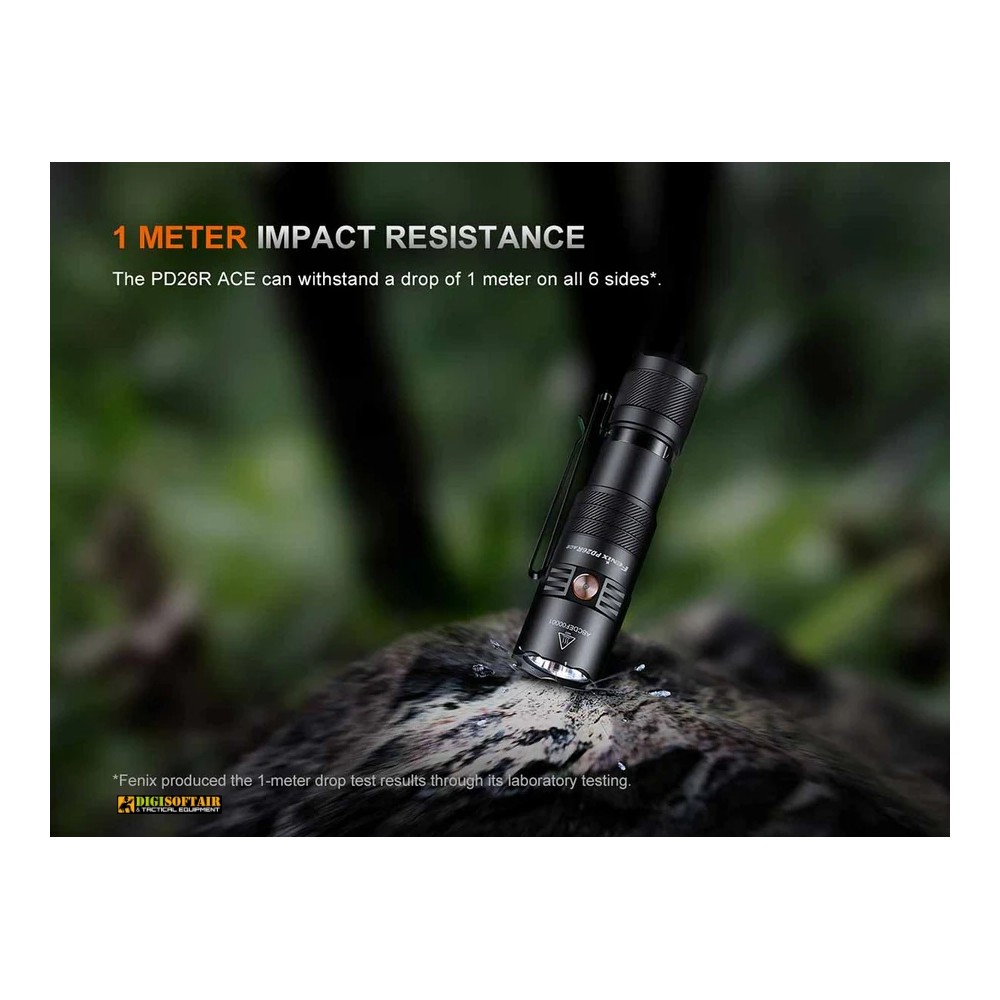 The Fenix PD26R ACE condenses strong performance into a pocketable format (106 mm): 1300 lumens and a beam reaching 354 m, while weighing only 102.3 g including battery. It offers seven lighting options — five brightness levels plus strobe and SOS — and a maximum runtime up to 556 hours on Moonlight. Constructed from A6061-T6 aluminum with a HAIII hard-anodized finish, and a toughened glass lens with anti-reflective coating, the PD26R ACE delivers reliable, stable output thanks to a digitally regulated circuit and a long-life Luminus SFT25R LED.