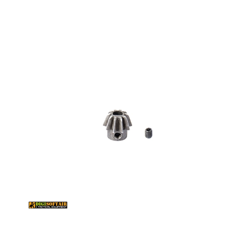 Evolution steel pinion with D-shape bore, designed as a replacement internal part for AEG gearboxes and motors. Built to withstand recreational use and restore smooth, reliable power transfer in worn gear trains. Fit it in place of the original pinion after confirming compatibility with your motor’s D-shaft.