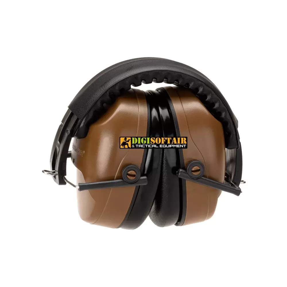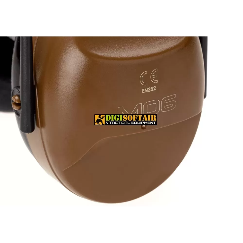 Earmor M06A Coyote passive earmuffs with NRR24 protection, foldable and comfortable for shooting range use.