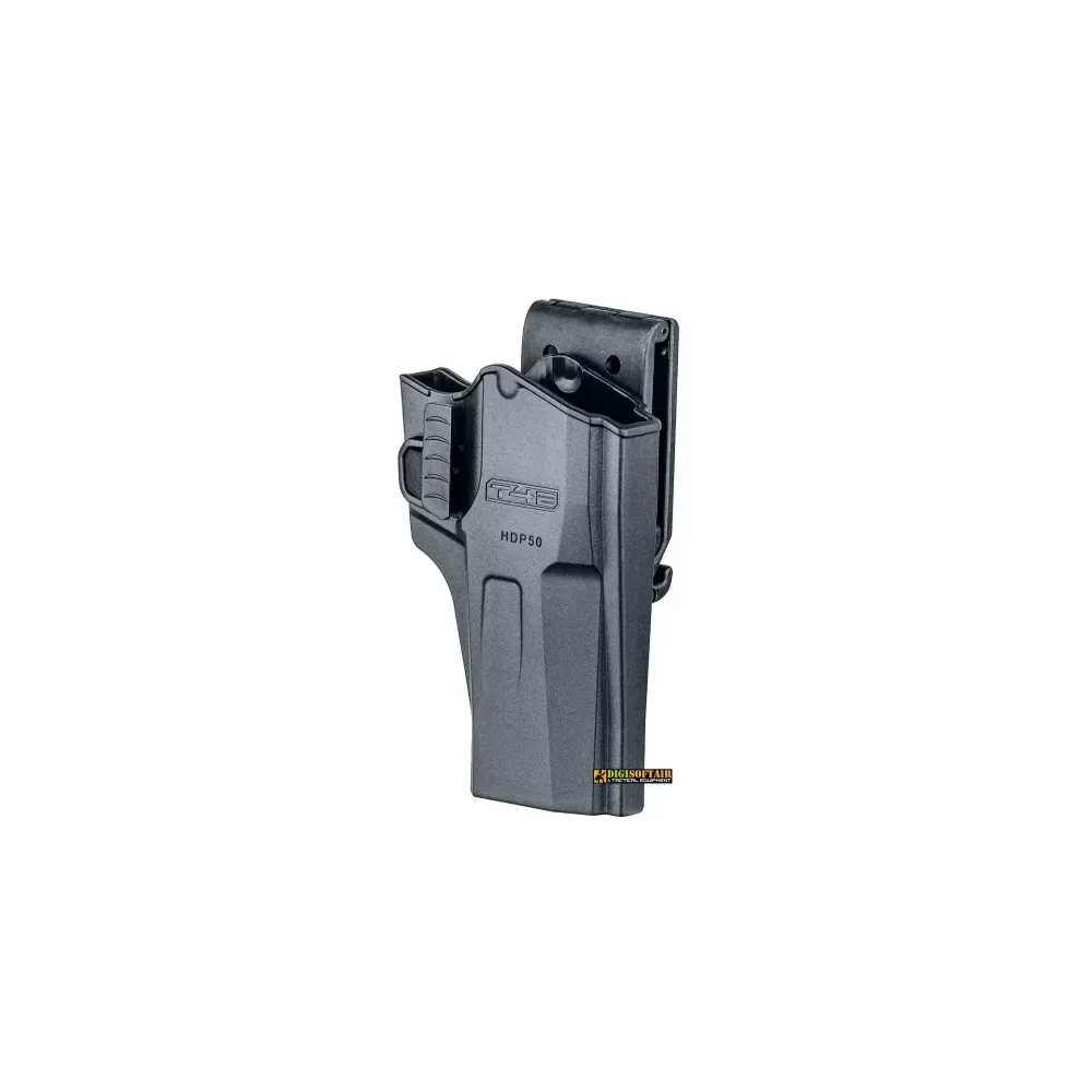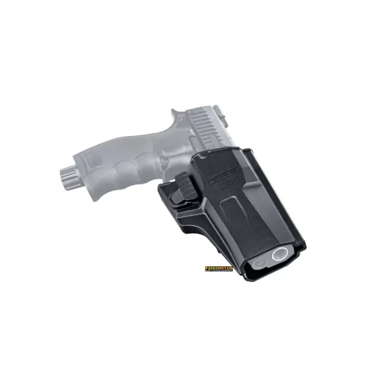 Designed to fit the T4E HDP 50, this paddle holster is made of impact-resistant polymer. The spring-loaded release button is in an intuitive position, and the belt attachment can be adjusted in height and matched to the belt width.
