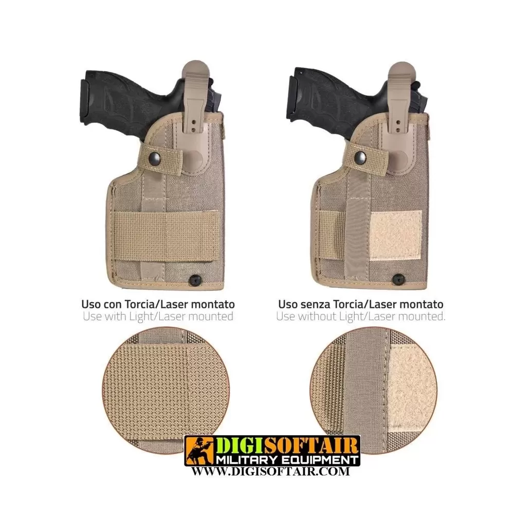 Special adjustability of the lower part makes this holster suitable for weapons with or without tactical light or laser.
