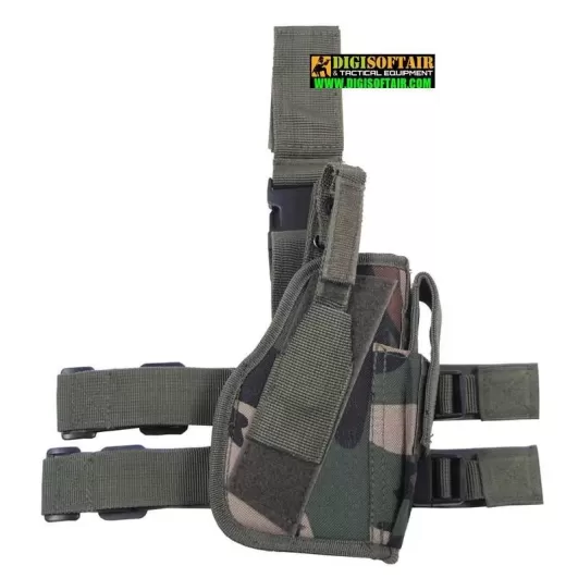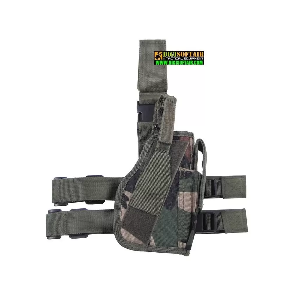 tactical holster for all handgunsadjustable and detachable belt fixation2 adjustable and detachable thigh strapssafty strap with press buttons and velcro closure ammo pouches with velcroMaterial:100% polyester