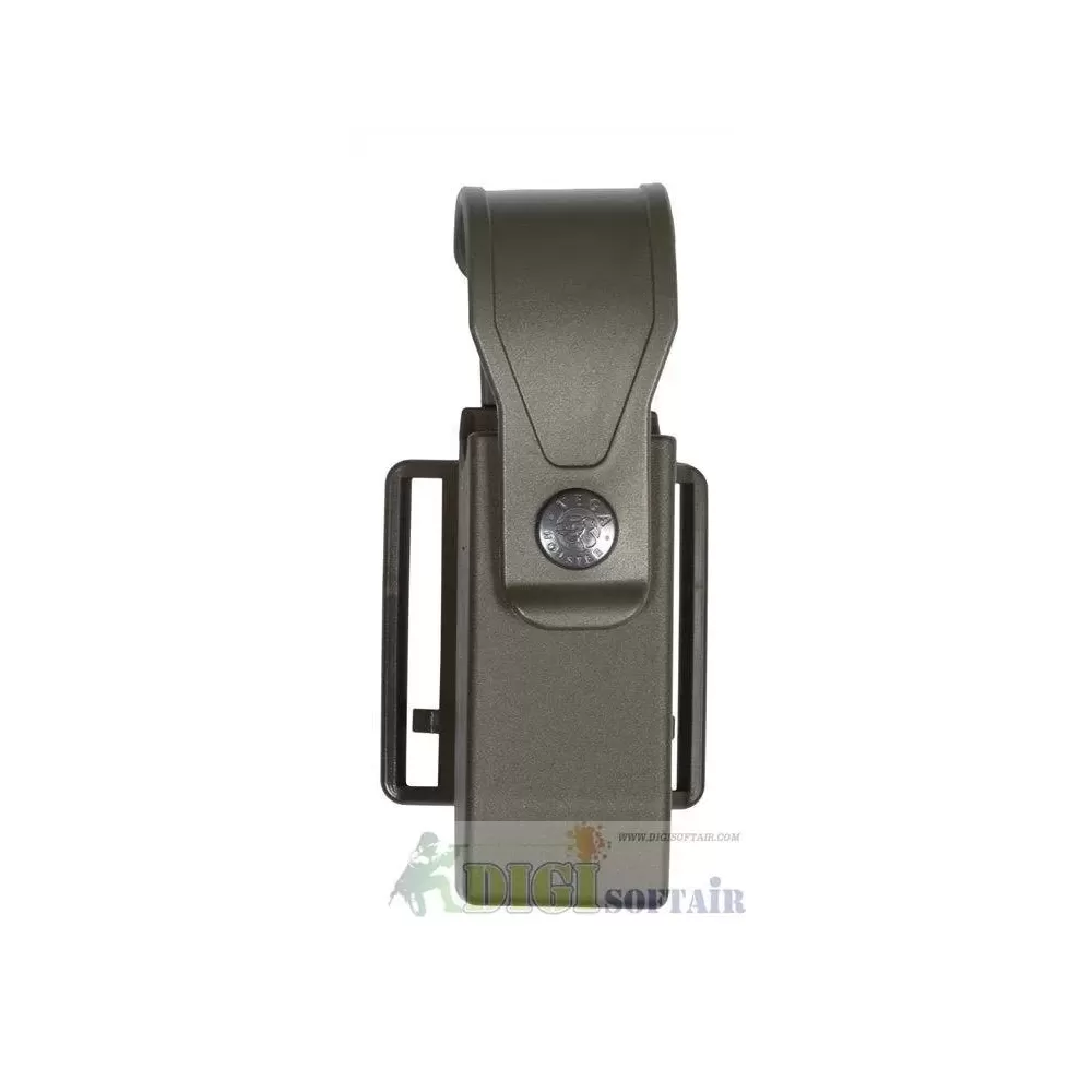 Injection molded polymer with swivel passage. Adjustable belt height adjustment for better fit to all sizes. Height adjustable and removable shoe for use of open loader. Removable outer button cover. Internal clips for better retention.