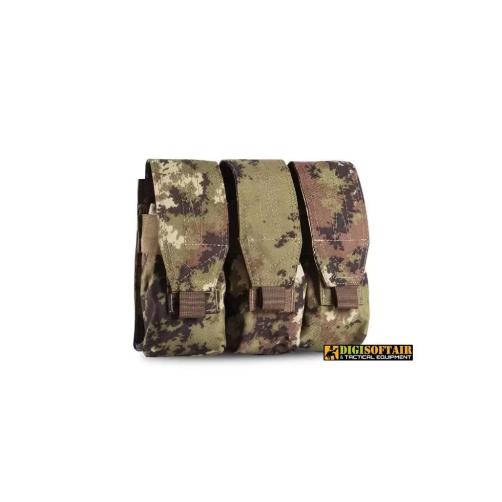 Triple magazine pouch, made of 1000D nylon, for M4/AK. Capacity 2 magazines per pocket, Velcro cover closure, elastic retention tape for each pocket, M.O.L.L.E.
