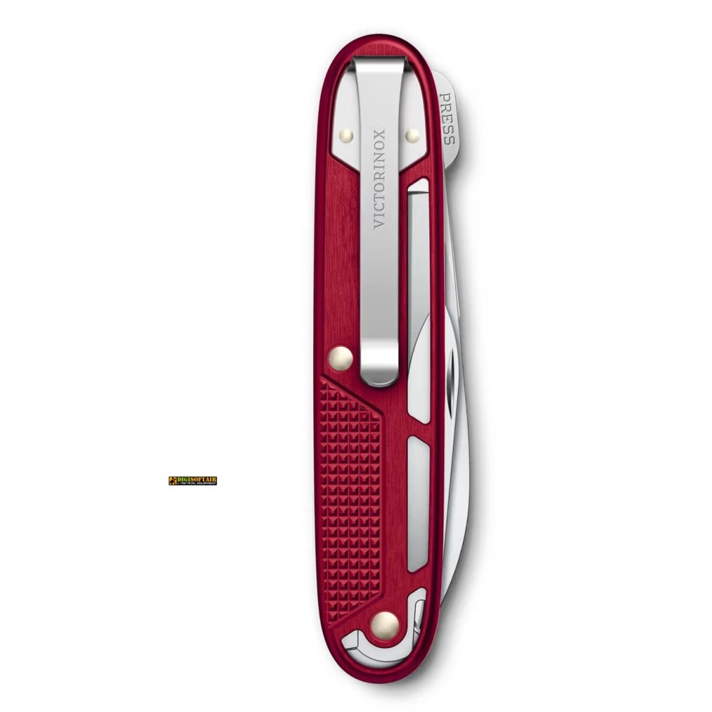 Victorinox Synergy Alox pocket knife with Red Alox scales, 9 essential functions and riveted carry clip for everyday use.