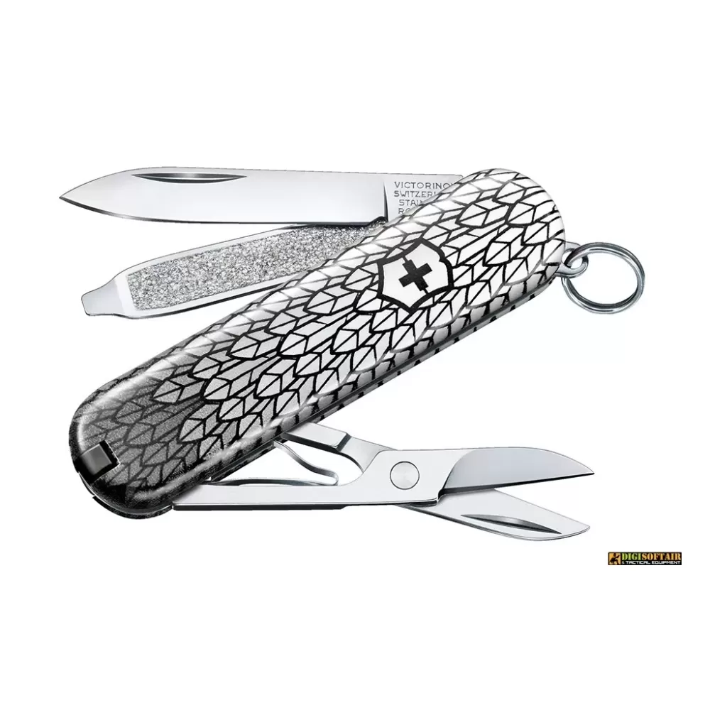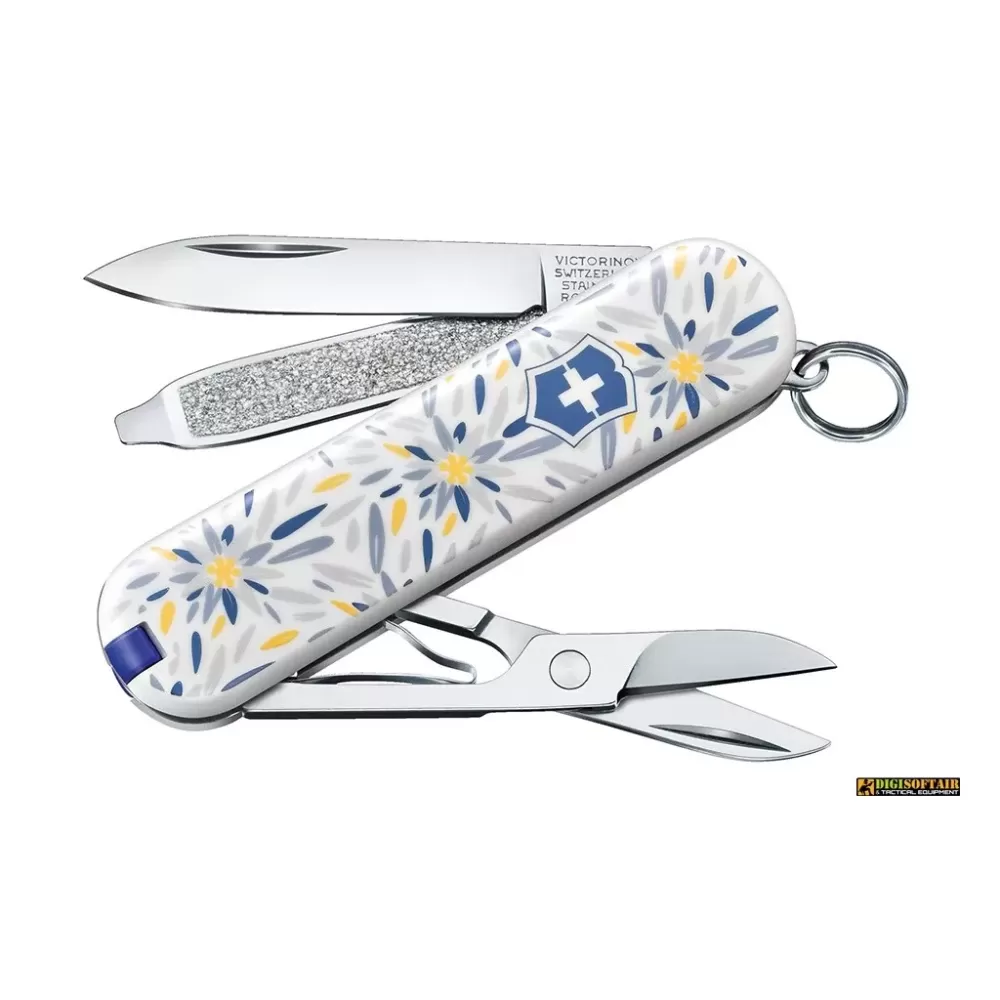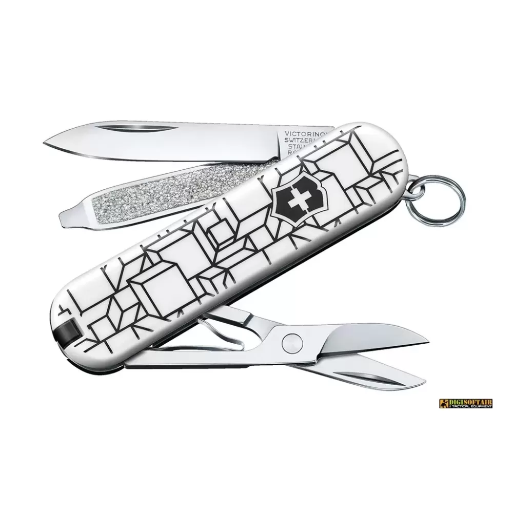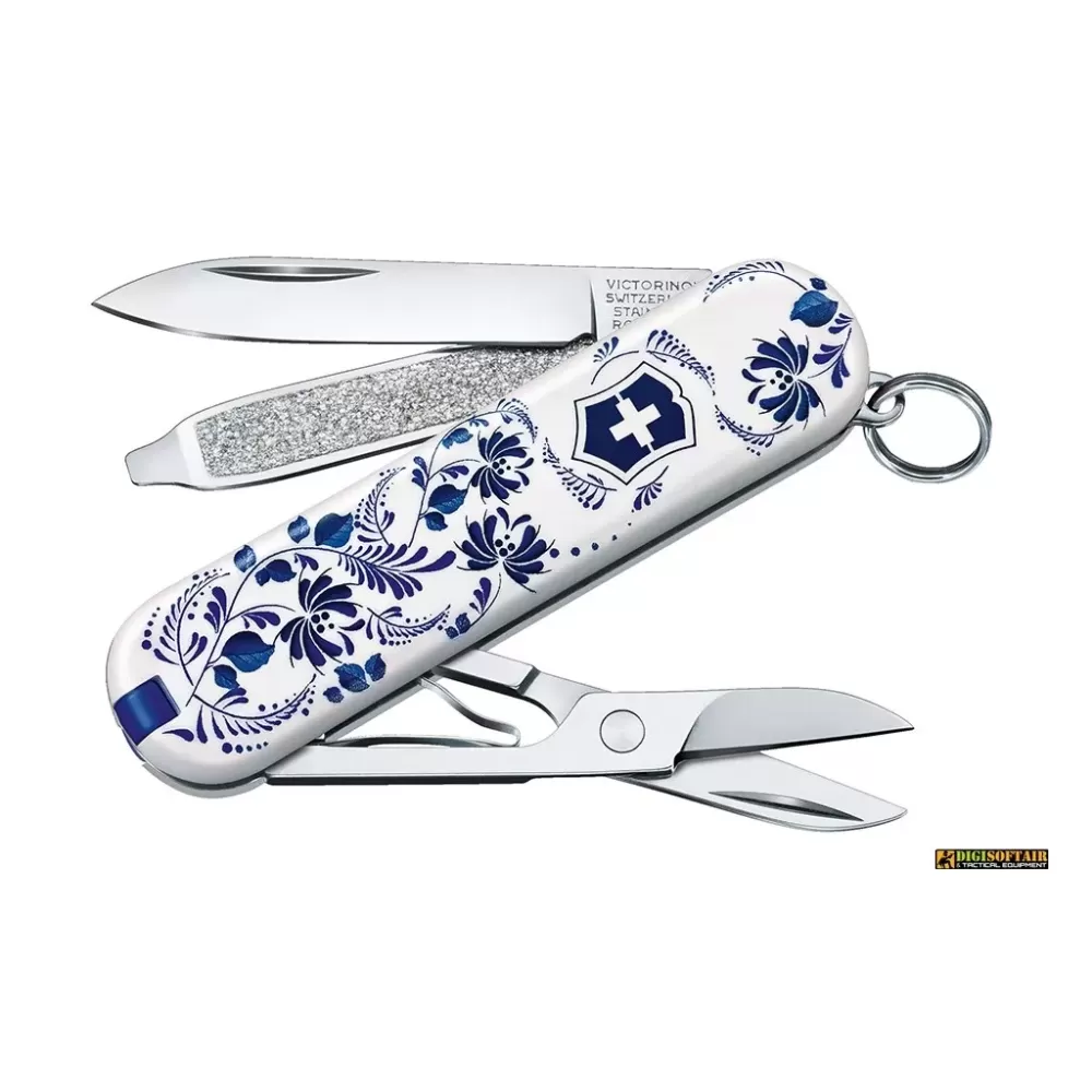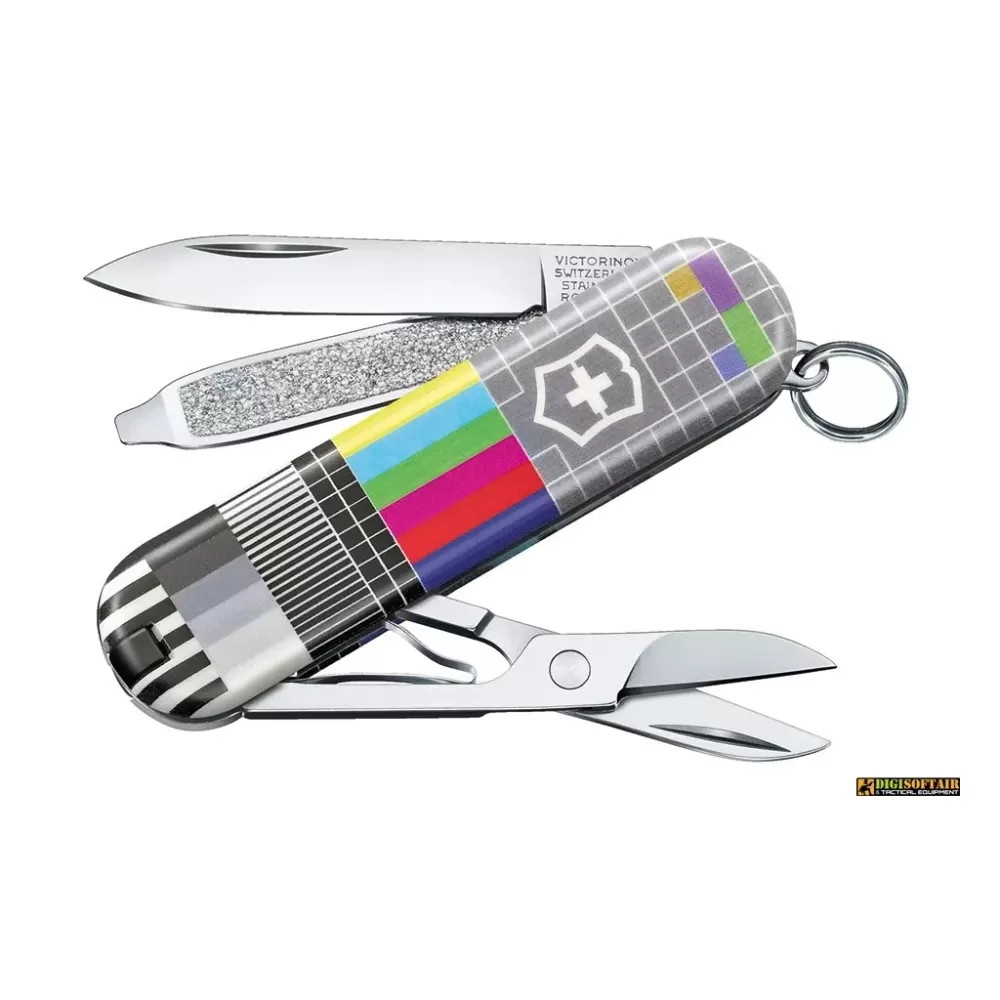 Classic multipurpose set of 10 Limited edition designed and chosen by the public on the theme "Patterns of the World". 1. Blade, small 2. Nail file with 3. - Screwdriver 4. Scissors 5. Key ring 6. Tweezers 7. Toothpick