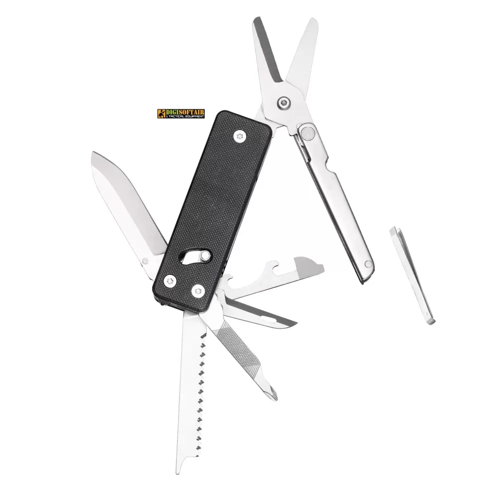 - 13 Functions in One: Scissors, Glass breaker, Flat screwdriver, Saw, Phillips screwdriver, Threader, Tweezer, Awl, Can opener, Bottle opener, Knife, Nail file, Rule.