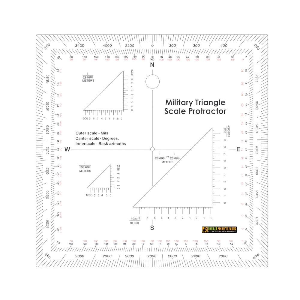 Transparent mil coordinate scale compatible with MGRS and USNG, clear graduations in degrees and mil, three scale types for use on 1:25 000, 1:50 000, 1:100 000 and 1:250 000 maps; durable impact-resistant plastic construction.