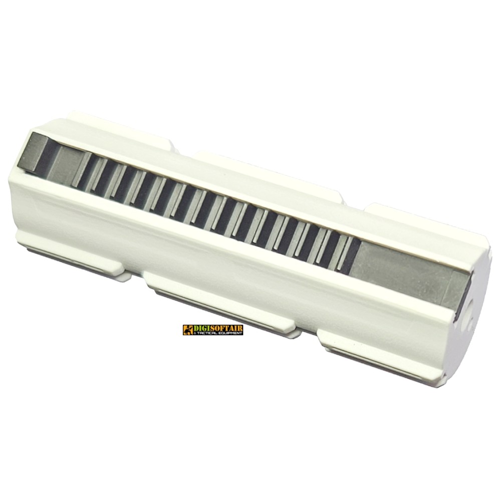 Intended for use only in compatible electric softair replicas. Install carefully, maintaining proper hop‑up alignment and avoiding forced fitting. Keep out of reach of children. Avoid prolonged exposure to heat or humidity. Do not disassemble or tamper with the piston. Regularly inspect teeth, guides, and internal ribs for integrity. Compliant with GPSR Regulation and Italian PPE standards.