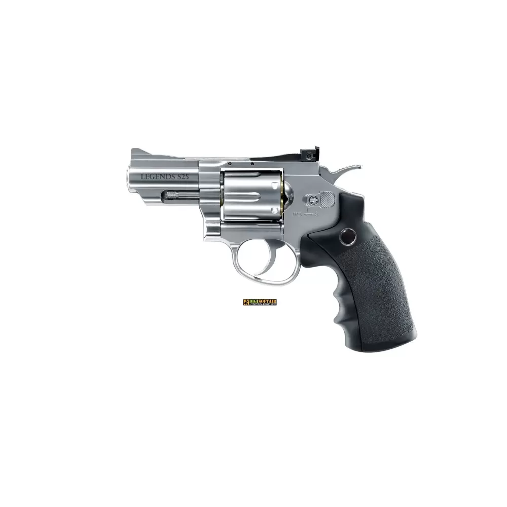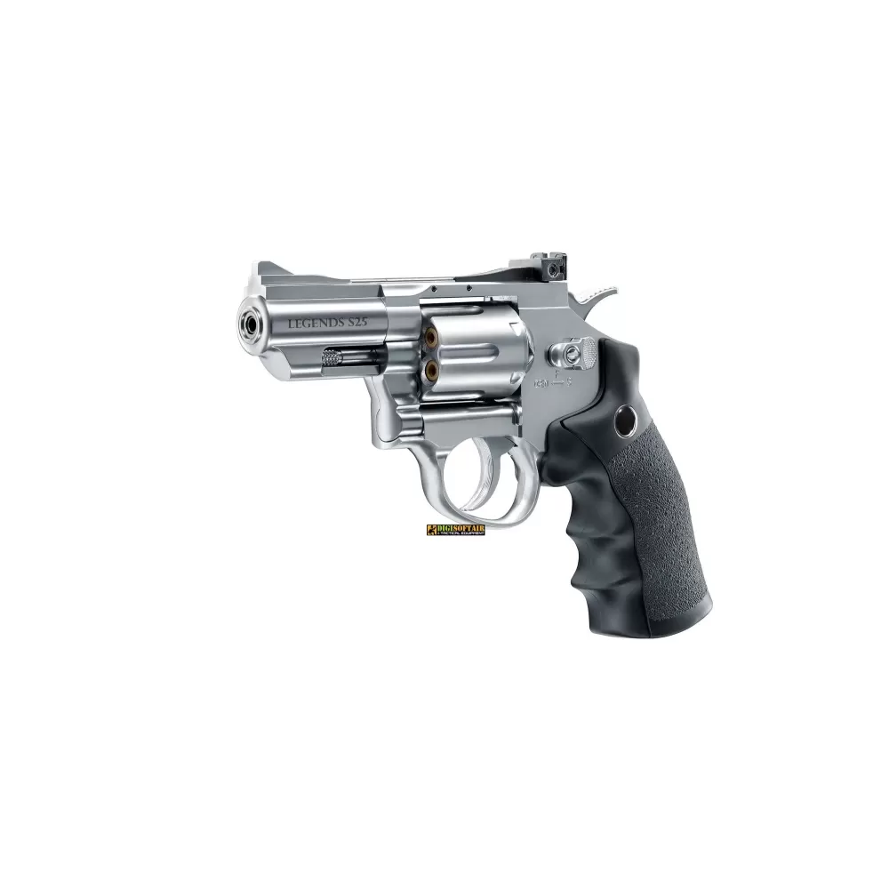 A truly high-quality revolver, all-metal, with a shiny nickel-plated finish: The three models in the Legends series, S25 (2.5 inches), S40 (4 inches) and S60 (6 inches), differ only in their barrel lengths. For authenticity they have six metal loading shells, each for one pellet, and a rifled barrel for accurate shooting. The rear sight is adjustable, and the barrel lock serves as a safety when pushed in the opposite direction.