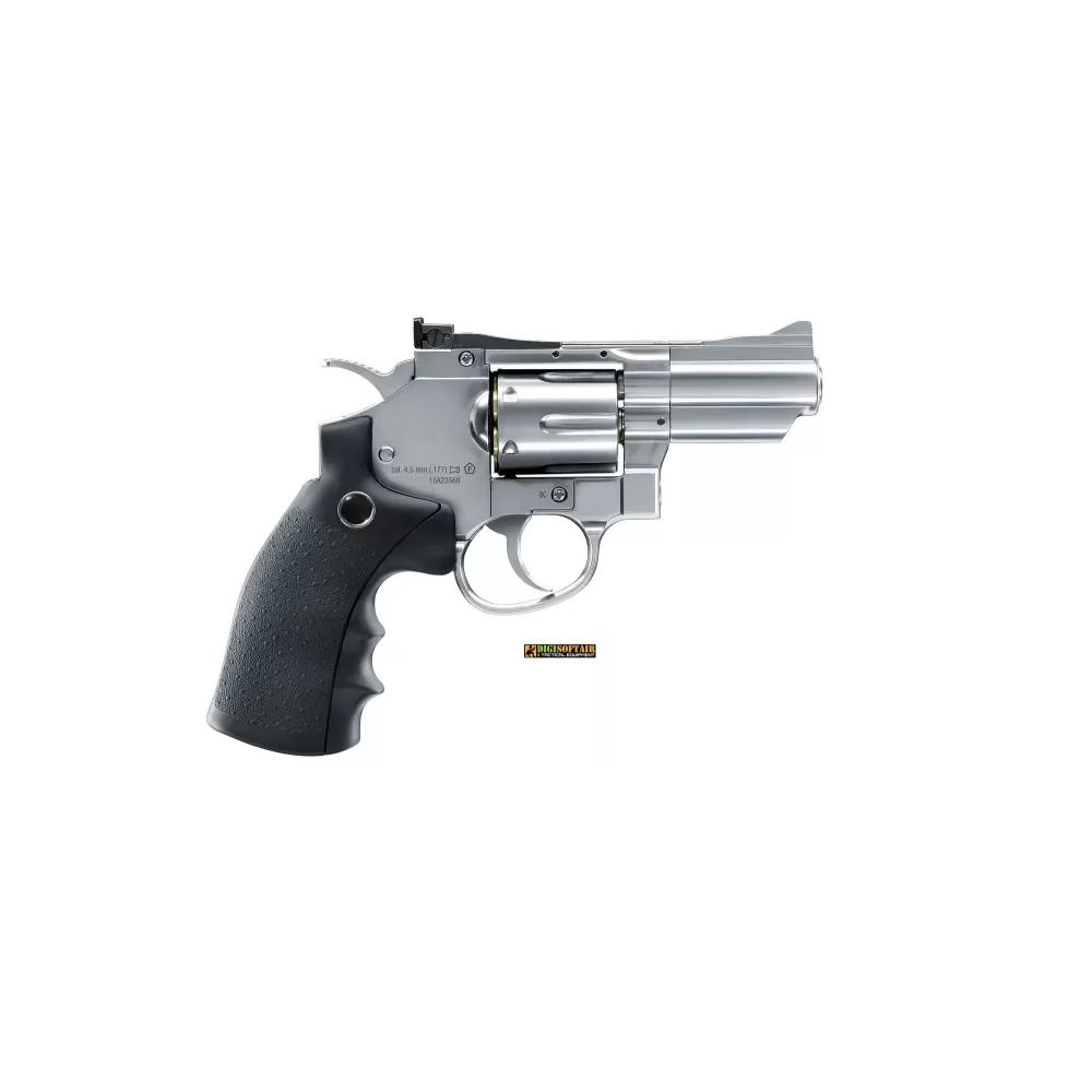 A truly high-quality revolver, all-metal, with a shiny nickel-plated finish, for authenticity they have six metal loading shells, each for one pellet, and a rifled barrel for accurate shooting. The rear sight is adjustable, and the barrel lock serves as a safety when pushed in the opposite direction.