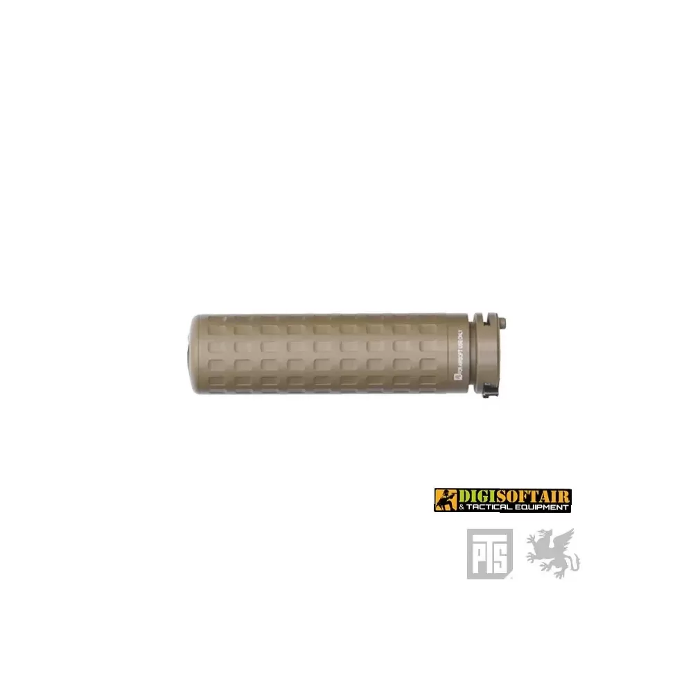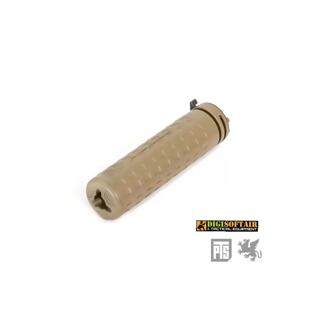 The PTS Griffin M4SD-K (dark earth) suppressor is an exclusive accessory designed for optimal airsoft performance. Made from super durable, ultra-lightweight aluminum, this suppressor offers an excellent combination of strength and lightness. Its design, licensed from Griffin Armament USA, features a grooved surface that reduces overall weight and ensures long-lasting durability.