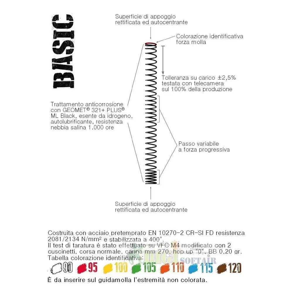 Molle made in Italy, con superficie di appoggio rettificata ed autocentrante, colorazione identificativa forza molla. Trattamento anticorrosione, molla a passo variabile Costruita con acciaio pretemprato. Le molle sono state testate su VFC M4 modiifcato con due cuscinetti, corsa normale, canna da 270mm, hop up scarico e pallini da 0,20gr dando i valori espressi dalla molla