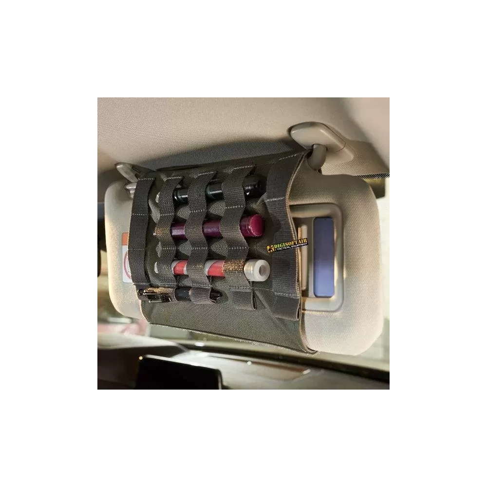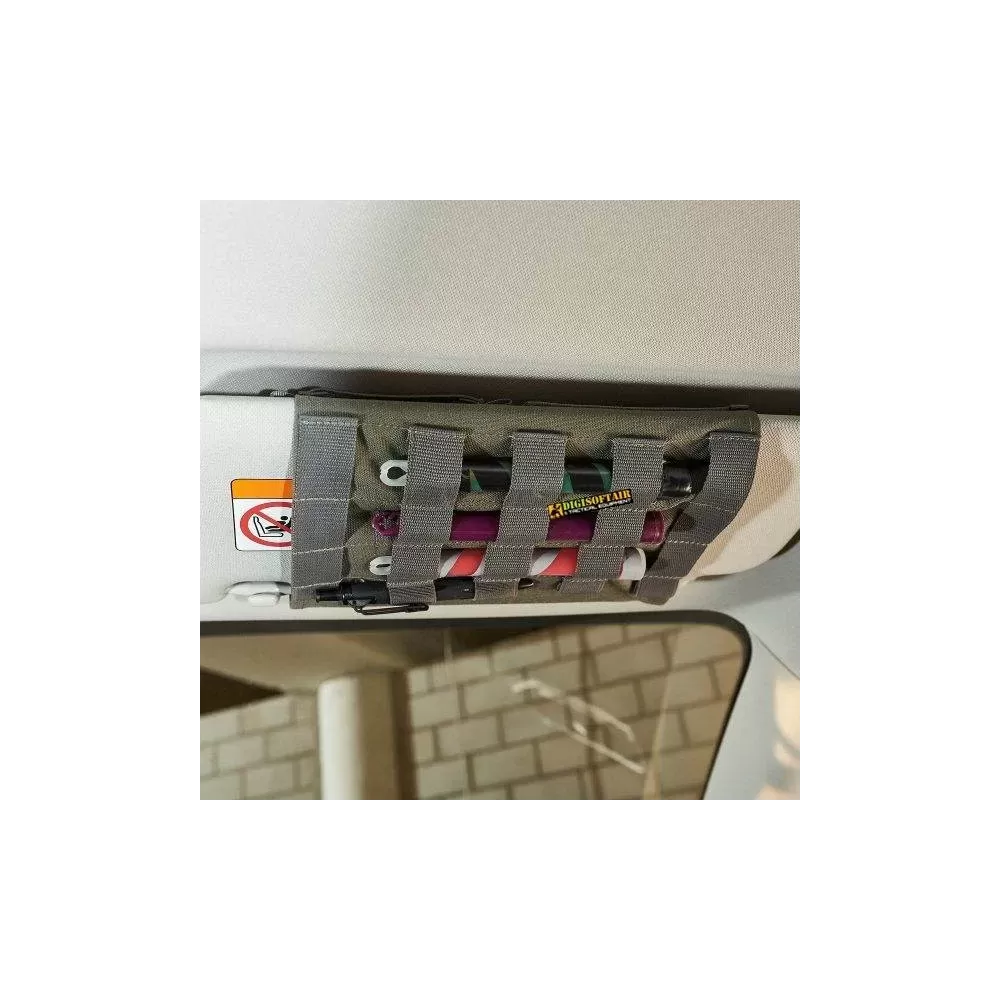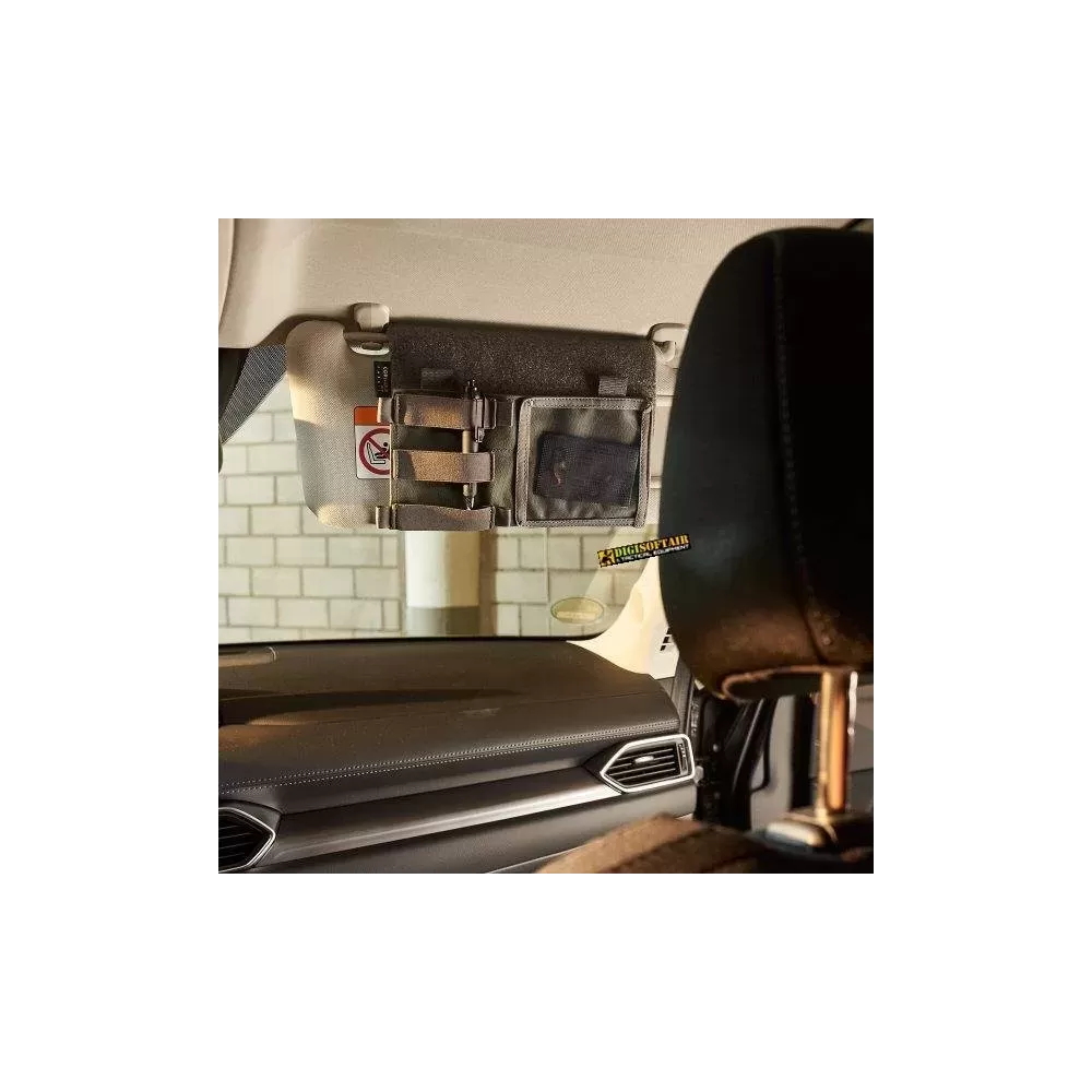 Length-adjustable MOLLE shell for attaching to vehicle sun visors. Includes ID cover. Part of the TacVec series.