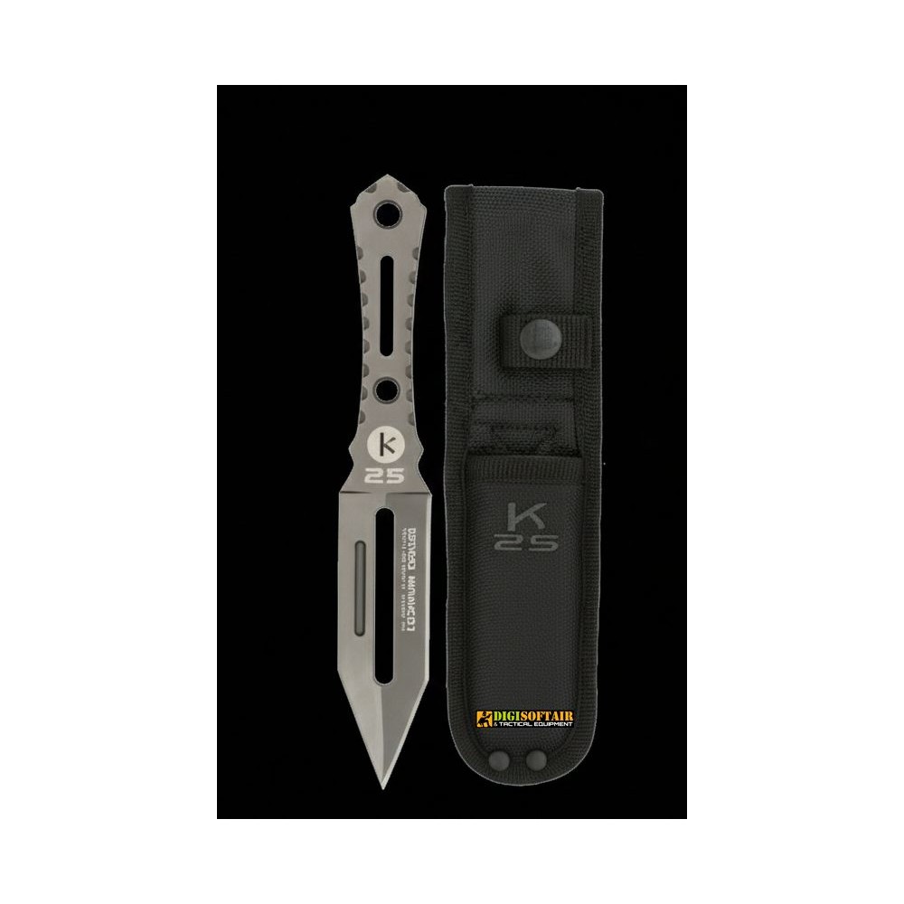 K25 Thrower 32375 fixed blade knife 9.5 cm 7Cr17Mov, full-tang, titanium coated; steel handle, nylon Molle sheath, total length 19.5