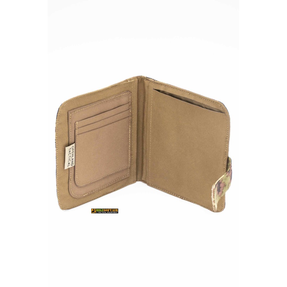 Openland Tactical memo pad in 100% polyester: front Velcro closure, external Velcro panels for patches, internal organization with pockets and slots. Compact when closed, large writing area when opened.