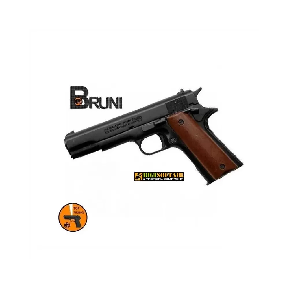 The Bruni M6 blank pistol is a faithful reproduction of the iconic 1911 model, making it ideal for collectors, historical reenactments, and training. Featuring single-action and semi-automatic operation, it delivers a realistic shooting experience, enhanced by its top firing system, which produces impressive visual effects.