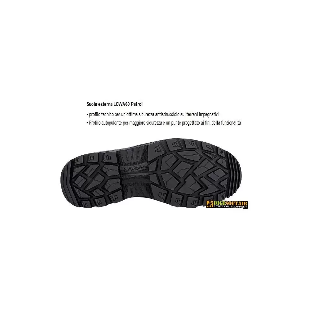 - Suola Esterna: LOWA® Patrol con profilo tecnico per un'ottima sicurezza antiscivolo su terreni impegnativi, profilo autopulente per maggiore sicurezza e un disegno delle punte ottimizzato per la funzionalità.