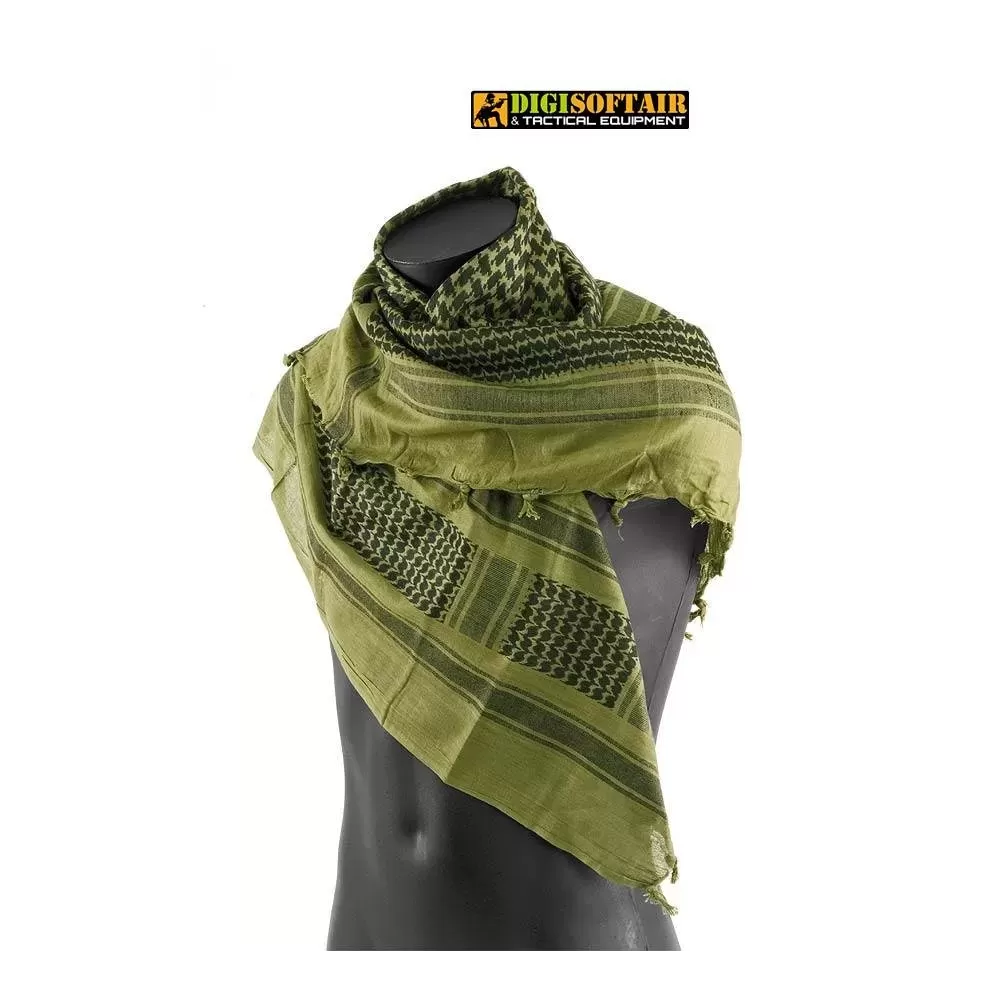 È realizzato in cotone 100 % con lavorazione jacquard di colore verde/nero o sabbia/nero. È inoltre realizzato senza cuciture ed i fi li alle estremità vengono fermati con nodi. Misura circa cm 110 x 110.