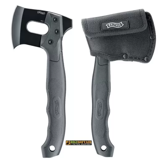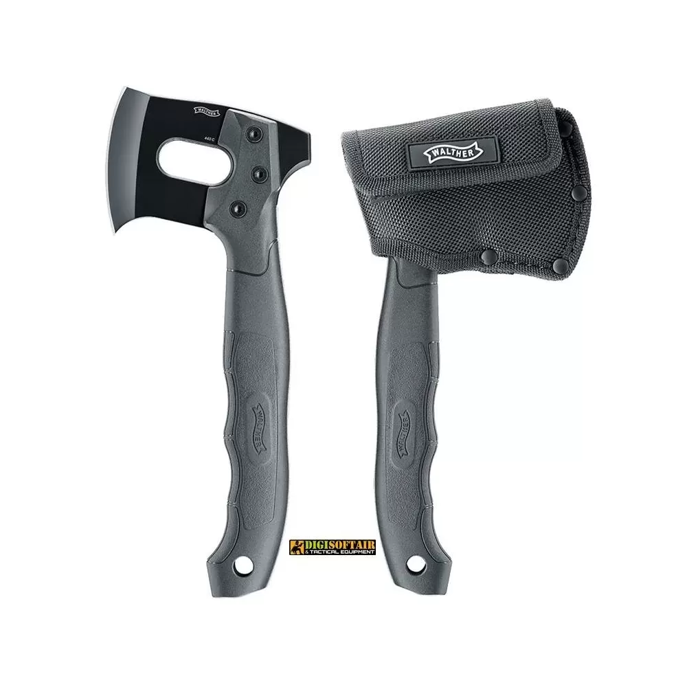 Ascia compatta Walther in acciaio 440C, 228 mm di lunghezza, 270 g di peso e impugnatura ergonomica in polimero testurizzato — maneggevole per outdoor, intaglio e lavorazioni di campo.