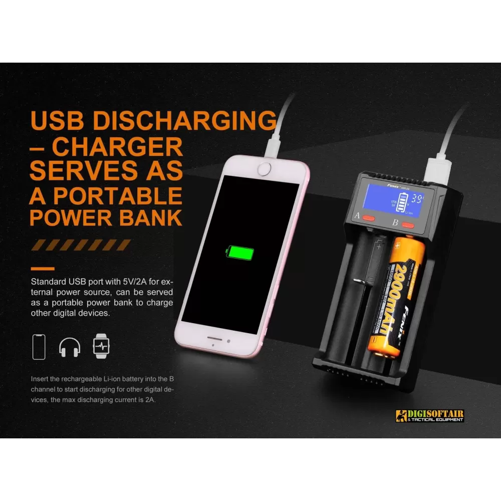 Il Fenix ARE-D2 è un caricabatterie intelligente a due canali progettato per coprire un’ampia gamma di batterie ricaricabili e fornire controllo raffinato della carica. È compatibile con batterie Li-ion (tra cui 10440, 14500, 16340, 18650, 21700, 26650) e con batterie Ni-MH/Ni-Cd (AAA, AA, C). L’ingresso è Micro-USB a 5V/2A che permette alimentazione rapida, e l’uscita USB 5V/2A consente di utilizzare il dispositivo anche come power-bank per altri dispositivi.