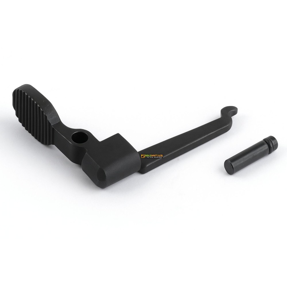 Funzione: leva bolt catch operativa lato ASG — non svolge funzione reale di blocco bolt su arma da fuoco; permette la chiusura del finto otturatore con bolt arretrato per regolazioni e manutenzione.