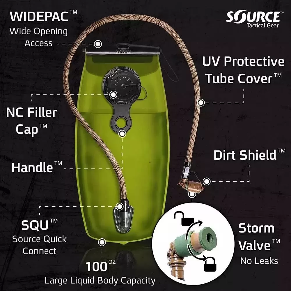 Battlefield si è rivelato vescica tattica. Durevole, affidabile e richiede praticamente zero manutenzione. L'acqua nella vescica SOURCE rimane fresca e gustosa per giorni e settimane. Maneggevolezza grazie all'ampia apertura Widepac e all'apertura con tappo a vite che si adatta alla maggior parte degli zaini per l'idratazione sul mercato.