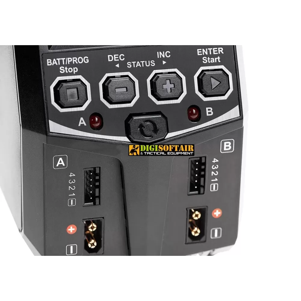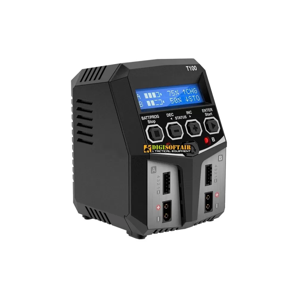Gestisci le batterie del tuo equipaggiamento tattico con massima efficienza grazie al T100 Multi-Chemistry Dual Charger Nimrod, un caricabatterie professionale capace di alimentare contemporaneamente due pacchi batterie di diverse chimiche. Il display LCD retroilluminato fornisce letture precise del voltaggio e dello stato di carica, mentre il firmware intelligente riconosce automaticamente il tipo e il numero di celle, impostando tensione e corrente ottimali per ciascun ciclo.
