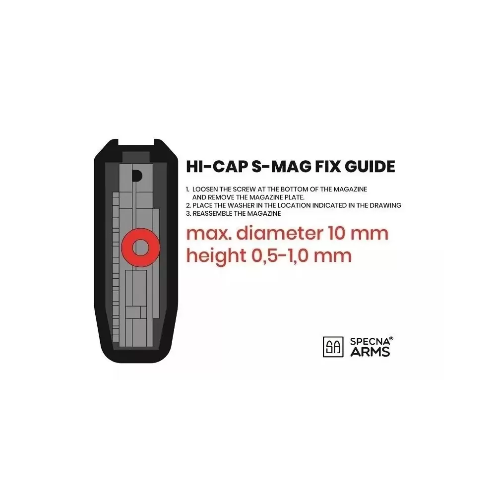 NOTA: I caricatori S-MAG non sono completamente compatibili con le repliche della serie H di Specna Arms. Per un funzionamento corretto, è necessaria la modifica del vano del caricatore.