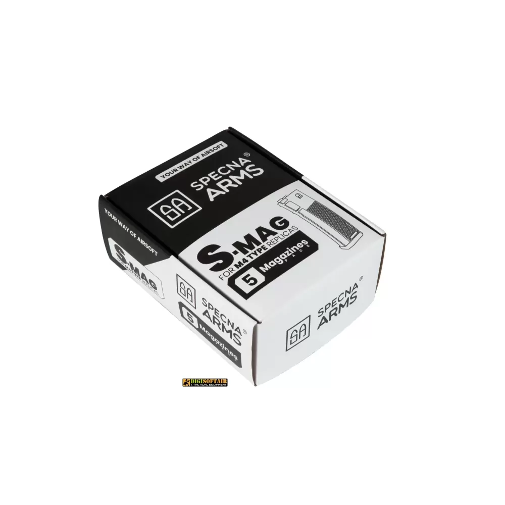 Specna Arms presenta i caricatori S-Mag in polimero, caratterizzati da una struttura compatta e resistente, oltre a un design pulito e funzionale. Un aspetto degno di nota è la texture unica, che include i loghi Specna Arms, migliorando il grip. Realizzato in polimero durevole, ogni caricatore ha una capacità di 125 BBs. La sua costruzione unica lo rende compatibile con la maggior parte delle repliche disponibili sul mercato ed è perfettamente adattabile a vari tipi di tasche tattiche. Gli S-Mag garantiscono un'alimentazione fluida dei BBs, anche a velocità di fuoco elevate.