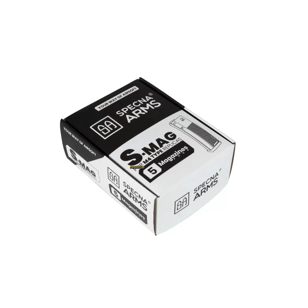 Specna Arms presenta i caricatori S-Mag in polimero, caratterizzati da una struttura compatta e resistente, oltre a un design pulito e funzionale. Un aspetto degno di nota è la texture unica, che include i loghi Specna Arms, migliorando il grip. Realizzato in polimero durevole, ogni caricatore ha una capacità di 125 BBs. La sua costruzione unica lo rende compatibile con la maggior parte delle repliche disponibili sul mercato ed è perfettamente adattabile a vari tipi di tasche tattiche. Gli S-Mag garantiscono un'alimentazione fluida dei BBs, anche a velocità di fuoco elevate.