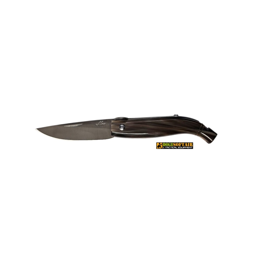 Pescatore con blocco Nista: coltello artigianale 19 cm (lama 8,5 cm) in AISI 420 MA5M con molla esterna bloccante e manico in corno. Firmato e garantito Italia.