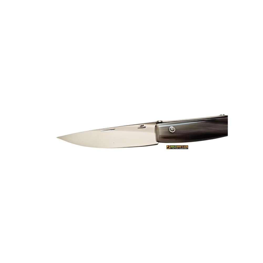 Pescatore lucido Nista 21 cm (lama 9,5 cm): finitura specchio, molla esterna, lama AISI 420 MA5M e manico in corno. Artigianale, firmato e garantito.