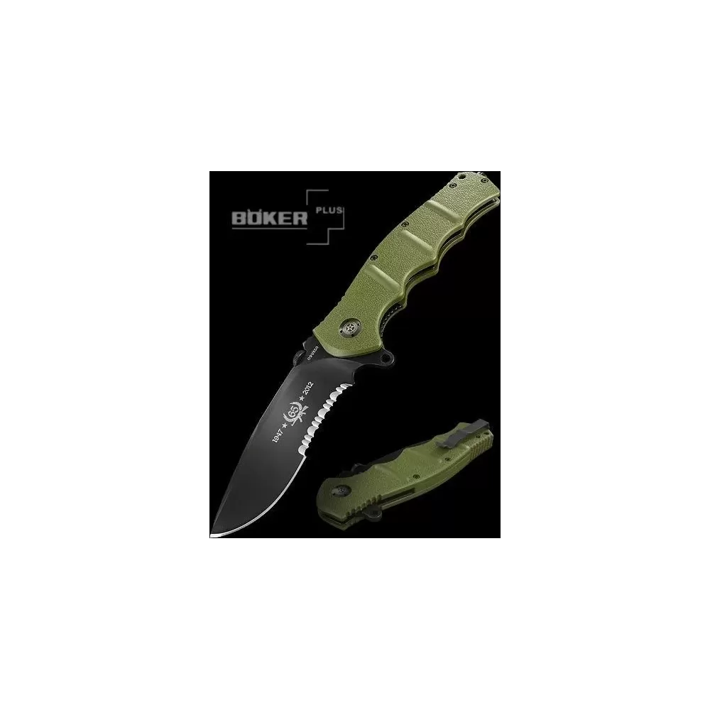 Coltello chiudibile liner lock. Lama satinata in acciaio 440C con rivestimento nero e parziale ondulatura, logo del Giubileo e impugnatura in Zytel verde oliva. Rompivetro sostituibile.