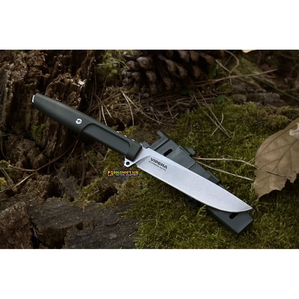 Il Vipera Ragner Green, Stone washed Nitrogen Con acciaio Nitrogen di Extrema Ratio è il coltello tattico perfetto per professionisti e appassionati che cercano massima efficienza in meno di 100 g. Nato dall’unione del Requiem (tattico puro) e del Mamba (survival essenziale), VIPERA concentra velocità d’impiego, robustezza da campo e taglio chirurgico.