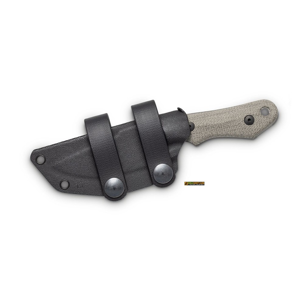 Il manico in canvas micarta verde, lavorato in 3D, offre un grip sicuro e confortevole anche con mani bagnate o guantate. Il codolo affusolato verso il retro contribuisce a migliorare il bilanciamento e la maneggevolezza. Il fodero in Kydex permette un porto sicuro, rapido e ambidestro, rendendo il coltello adatto a escursionisti, operatori e appassionati che cercano un EDC premium sempre pronto all’uso.