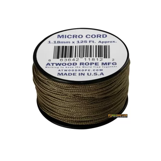La Micro Cord (125 ft) è una corda da sopravvivenza estremamente versatile e resistente, lunga circa 38 metri, con una capacità di trazione di 46 kg (100 lbs) e un diametro di 1,18 mm.