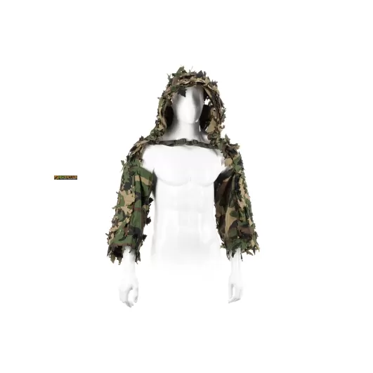 Il Sniper Bolero Leaf di Invader Gear è progettato per migliorare le proprietà di mimetizzazione e ridurre il peso complessivo. Tipicamente indossato sopra lo strato base dell'uniforme e l'equipaggiamento, questo sopravveste è realizzato con un tessuto leggero ma resistente, in un motivo dirompente. La base del Sniper Bolero è una copertura tipo bolero con una rete mimetica e pezzi di tessuto a forma di foglia cuciti sopra. Una fibbia regolabile sul petto e corde elastiche integrate nelle maniche offrono all'utente un alto grado di regolazione e comfort.
